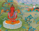 The White Tara and Bodhisattvas Thangka Print, featuring Amitayus and Namgyalma, presents a sublime depiction of divine grace and compassion within Tibetan Buddhism. White Tara, revered as the embodiment of compassion and healing, is depicted in a serene posture, radiating tranquility and wisdom. Flanked by the Bodhisattvas Amitayus and Namgyalma, who represent longevity and victory over obstacles respectively, the Thangka Print exudes a sense of profound spiritual energy and blessings. Each deity holds symbolic attributes, such as the vase of nectar held by Amitayus and the victory banner held by Namgyalma, signifying their ability to grant blessings and overcome suffering. Together, they form a powerful triad of compassion, healing, and longevity, inspiring practitioners to cultivate virtues of compassion and wisdom in their spiritual practice. Displayed in homes, meditation spaces, or temples, the White Tara and Bodhisattvas Thangka Print serves as a visual reminder of the boundless compassion and blessings that emanate from these divine beings, offering solace and guidance on the path to enlightenment.