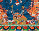 A wrathful manifestation of Manjushri, the Bodhisattva of Wisdom, Yidam Yamantaka represents the victory over the cycle of death and rebirth and leads followers to enlightenment and freedom. Depicted in a dynamic and wrathful form, Yamantaka symbolizes the ultimate victory over ignorance, fear, and mortality. His fiery presence exudes both strength and compassion, making him a powerful emblem of spiritual transformation and protection. Printed on canvas using the Giclee technique, this thangka exquisitely depicts the rich colors and minute details of the original sacred artwork.