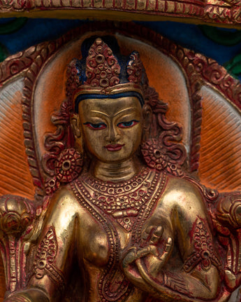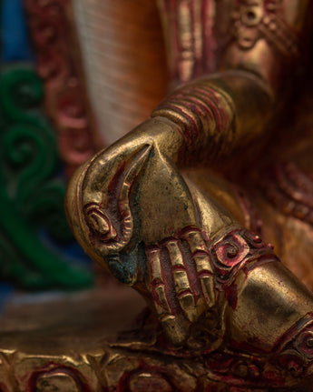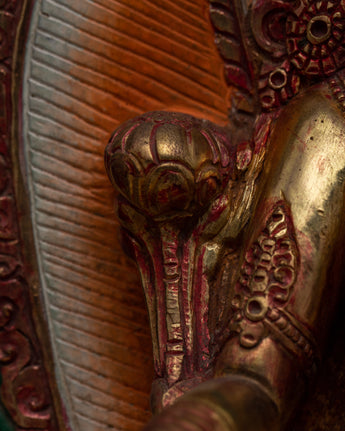 The 21 Tara Statues, each carefully handcrafted on a copper body, are exquisite representations of ancient craftsmanship. These sculptures have exquisite gold plating, highlighting their fine features and giving them a brilliant, opulent appearance. The artists' talent and devotion are demonstrated by the fine carving of all 21 Taras, which perfectly captures the spirit and beauty of these venerated figures. In addition to adding elegance, the gold plating on the statues denotes their holiness and heavenly essence.