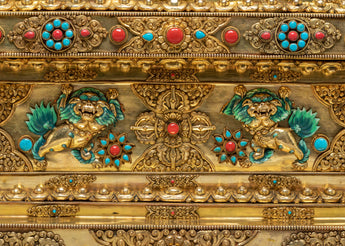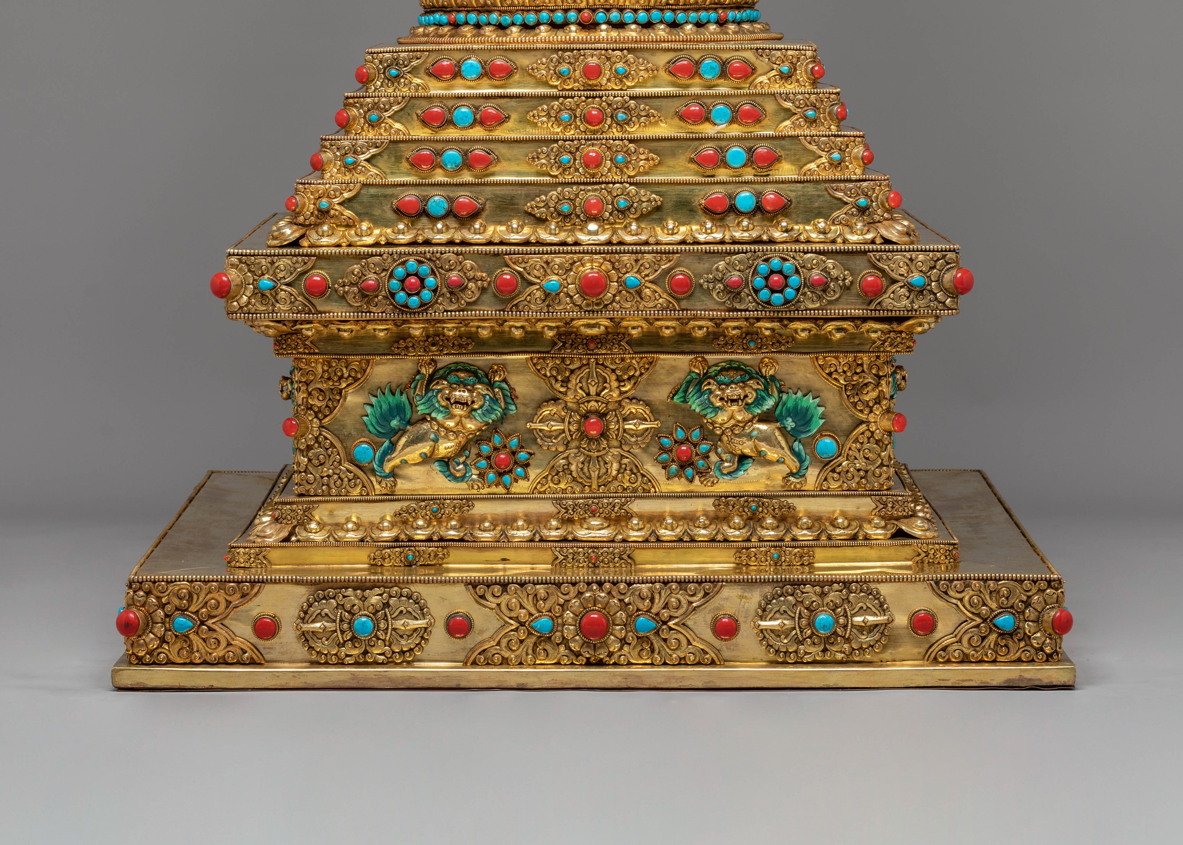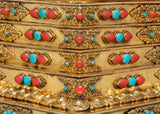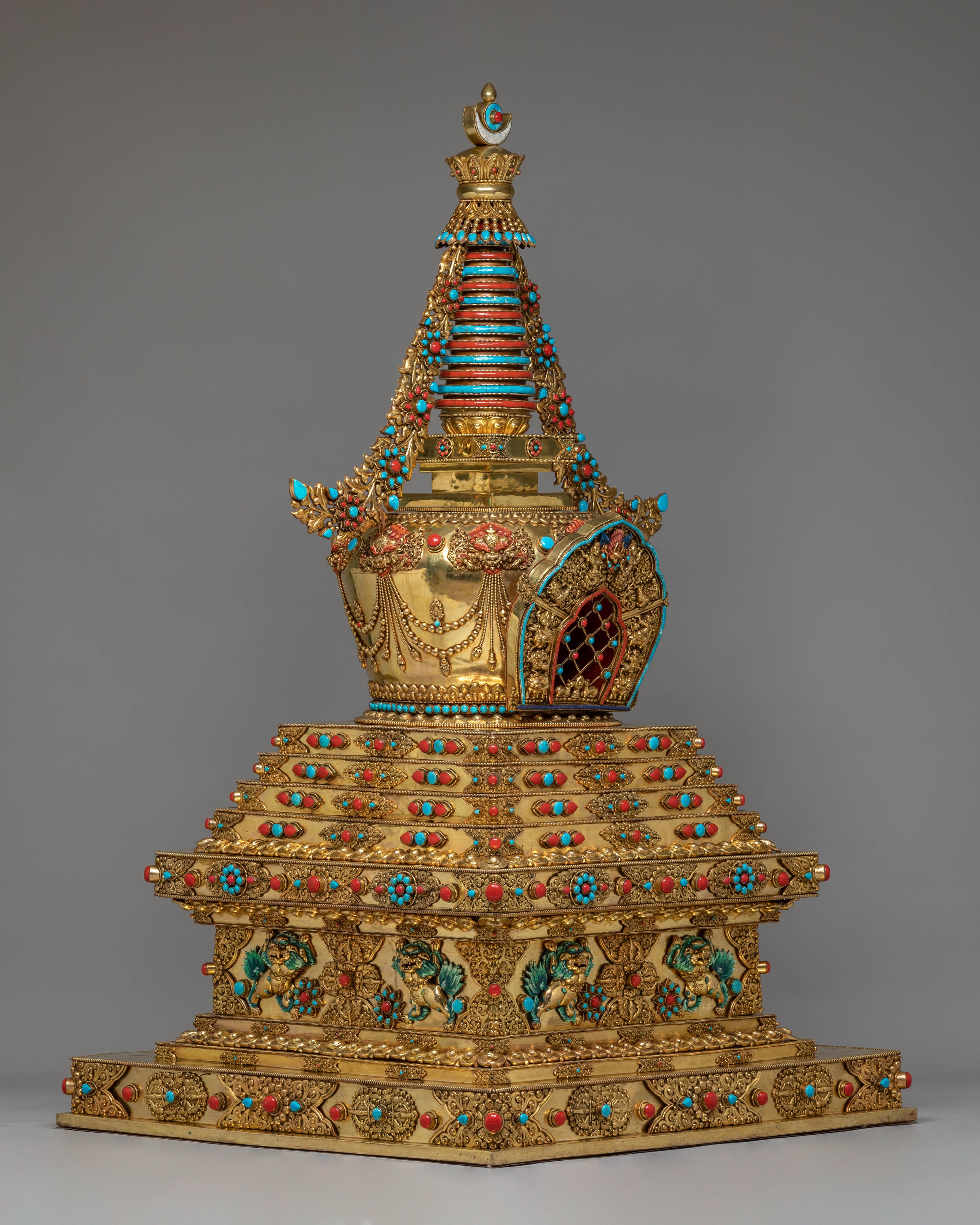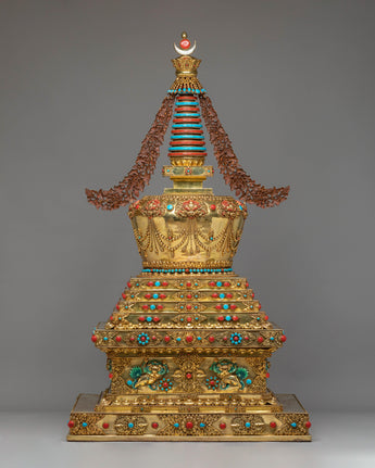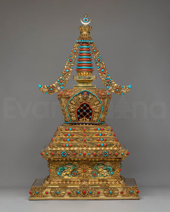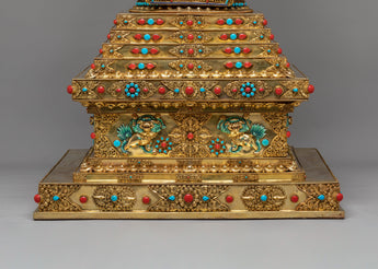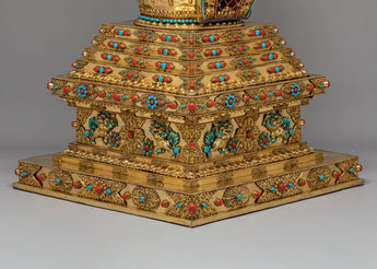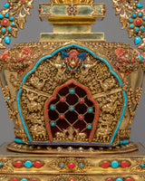 The stupa’s design is steeped in rich symbolism. At the top, the stupa’s architectural features—such as the dome-like structure—represent the cosmic axis, connecting the heavens and the earth, a traditional Buddhist symbol of the universe's spiritual harmony. The coral stones, known for their vibrant red hue, symbolize life force, vitality, and protection, while the turquoise stones are believed to bring peace, wisdom, and healing. The gold plating reflects enlightenment and the aspiration to transcend material attachments, while the intricate carvings on the stupa's body depict traditional Buddhist motifs, including guardians, deities, and mythological creatures, symbolizing protection and spiritual guardianship.
