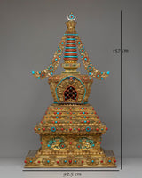 The Buddhist Handcrafted Sacred Stupa is a masterful work of art, embodying the essence of Buddhist teachings and the journey towards enlightenment. Standing at 157 cm tall, this monumental piece is handcrafted from premium copper, meticulously gold-plated to create a radiant, luminous finish that symbolizes the path to spiritual awakening. The stupa is adorned with vibrant coral and turquoise stones, which are deeply sacred in Tibetan culture, representing purity, wisdom, and divine protection. These elements are carefully placed throughout the design, enhancing both the beauty and the spiritual power of the stupa. The striking combination of gold, coral, and turquoise makes this piece a stunning focal point for any meditation room, altar, or sacred space.