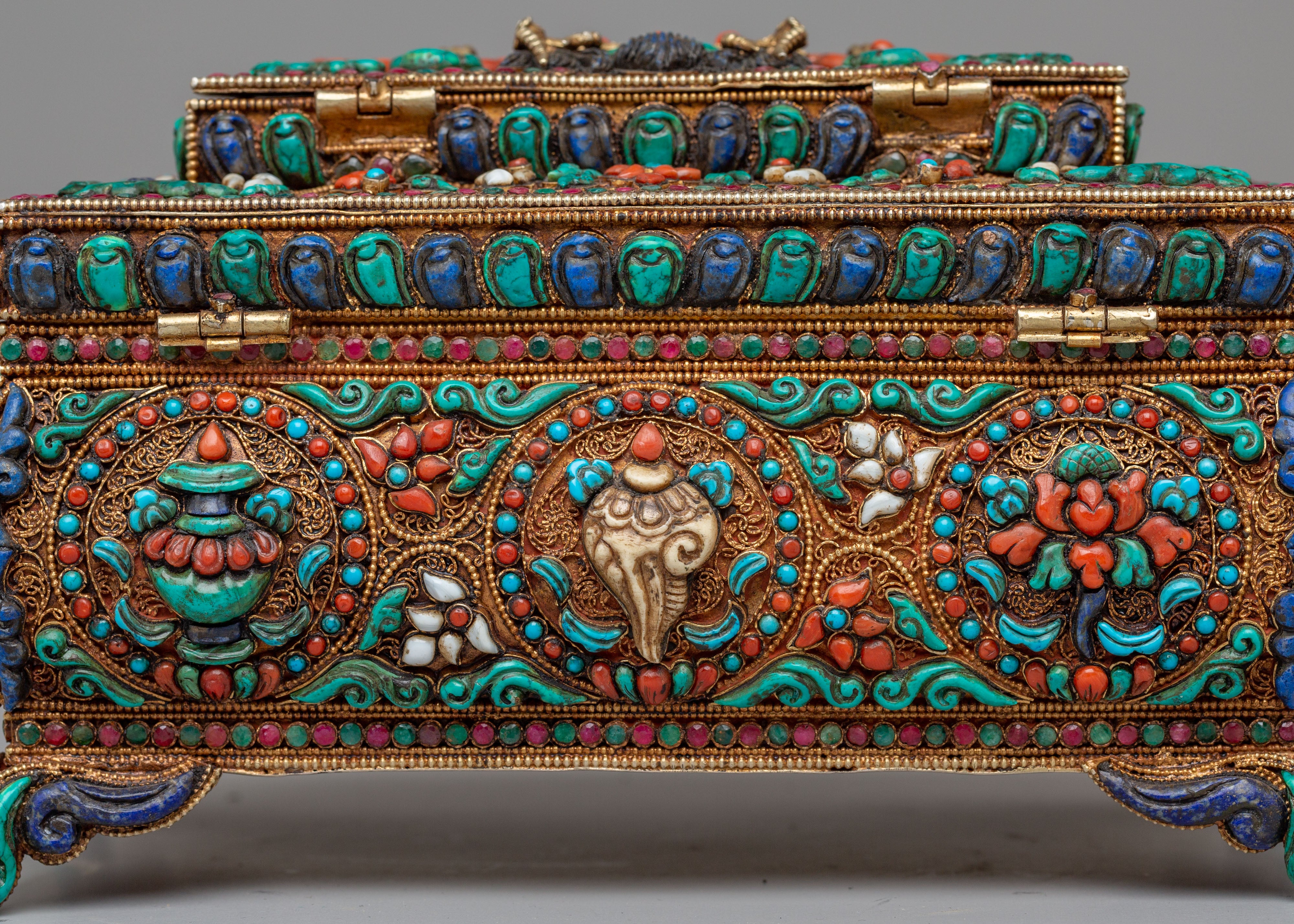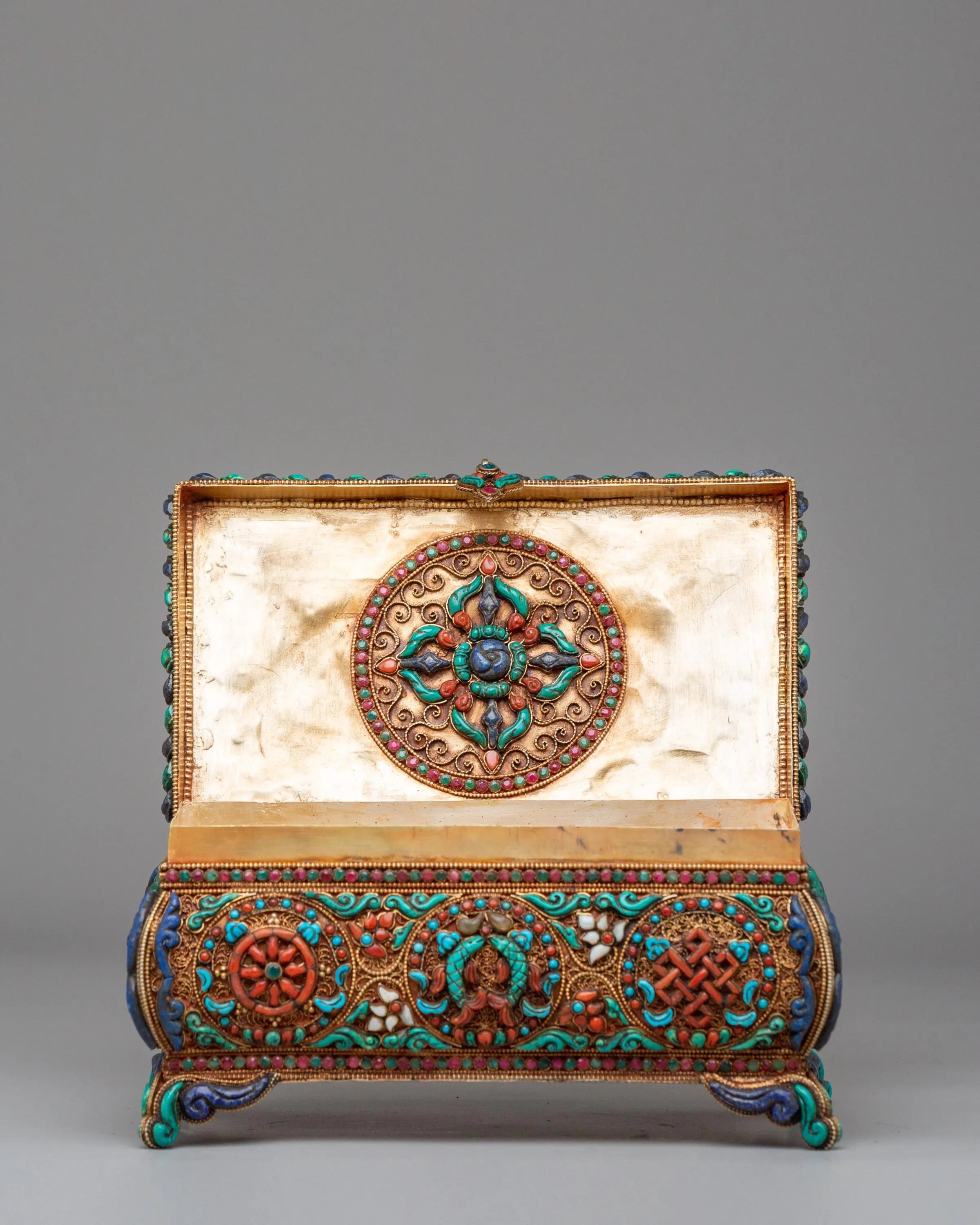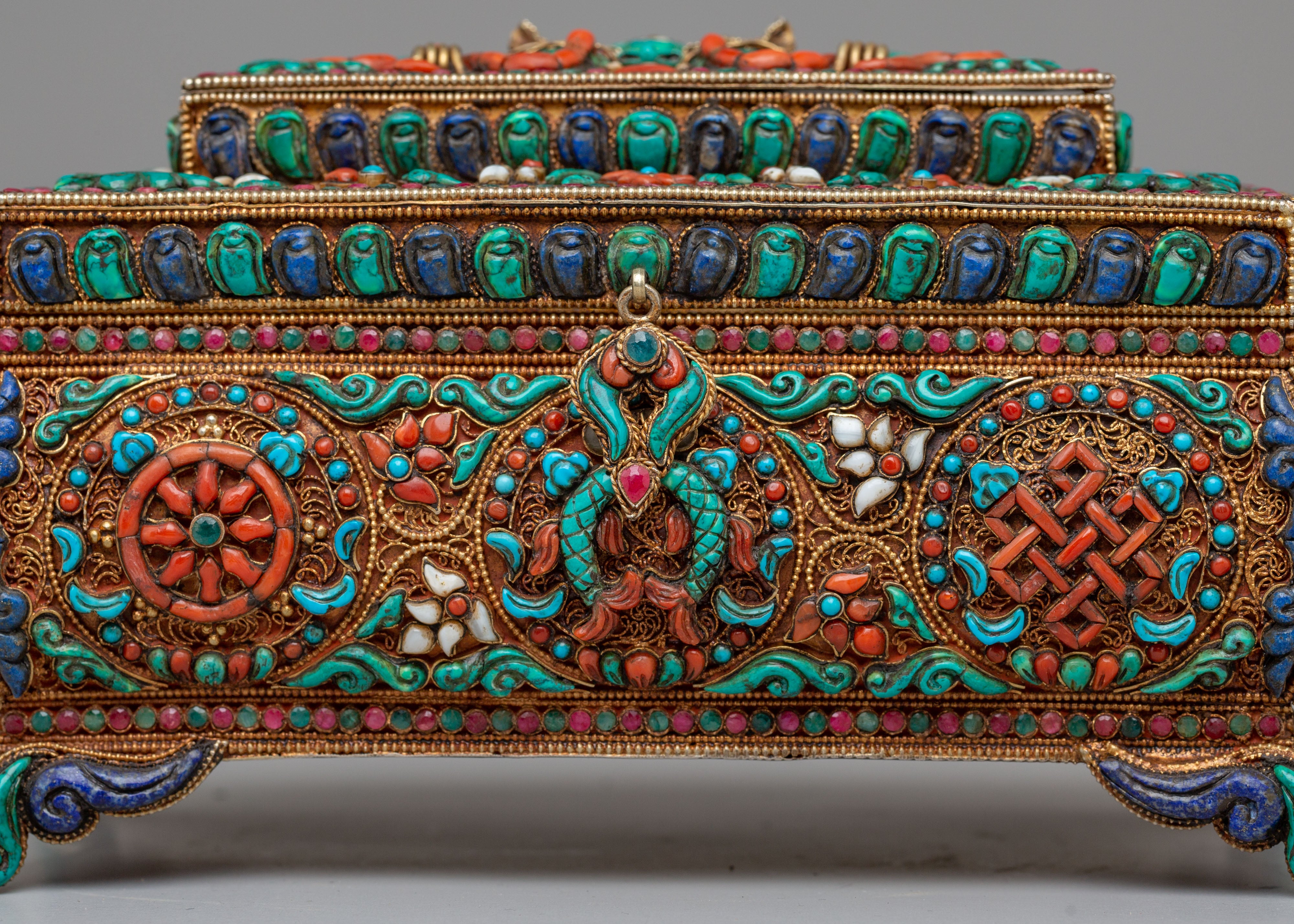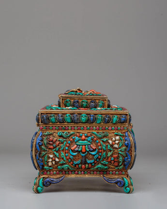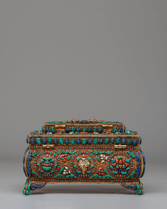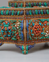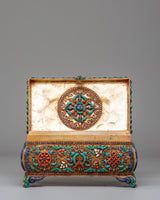 The design of this jewelry box is inspired by the timeless motifs of Tibetan craftsmanship, where turquoise symbolizes protection and wisdom, coral is believed to bring vitality and positive energy, and lapis lazuli represents spiritual enlightenment. These stones are set into meticulously detailed patterns on the surface and inside of the box, including symbolic designs like the eternal knot, which signifies the interconnectedness of all life. The decorative elements are not only beautiful but serve as spiritual reminders of harmony, protection, and wisdom, making the box a meaningful addition to any sacred space or personal collection.