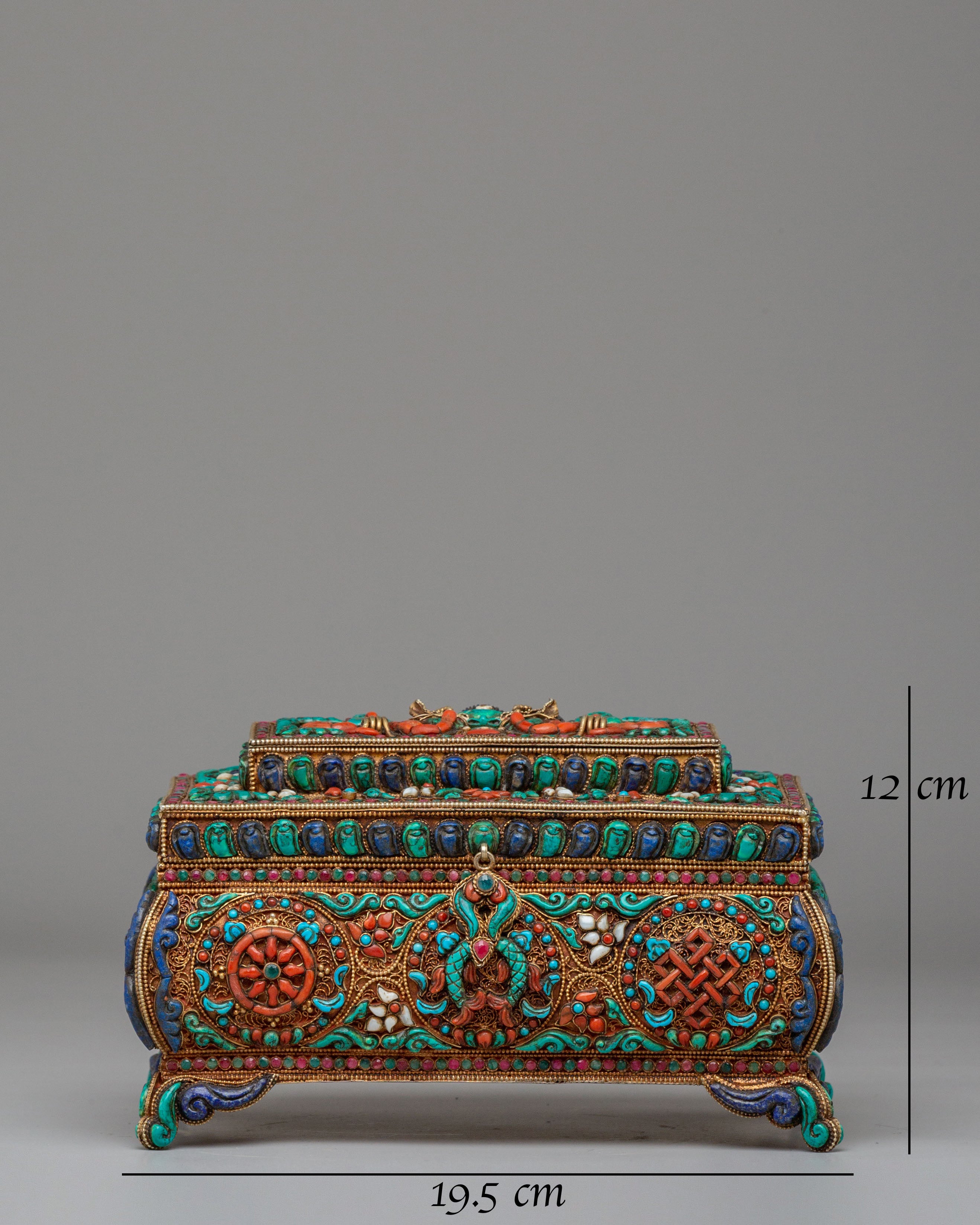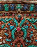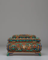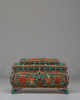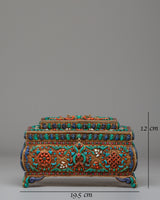 This Decorative Jewelry Box is an exquisite piece of craftsmanship, designed to store and display your most cherished items with elegance and spiritual meaning. The box, measuring 12cm in height and 19.5cm in width, is made of a solid silver and copper frame, enhanced with vibrant turquoise, coral, and lapis lazuli stones. These semi-precious stones are intricately set in traditional Tibetan designs, creating a stunning visual that captures the richness of Eastern artistry. Weighing 1.11kg, the box’s substantial feel reflects the quality of craftsmanship involved in its creation, making it not only functional but also a piece of art in itself.