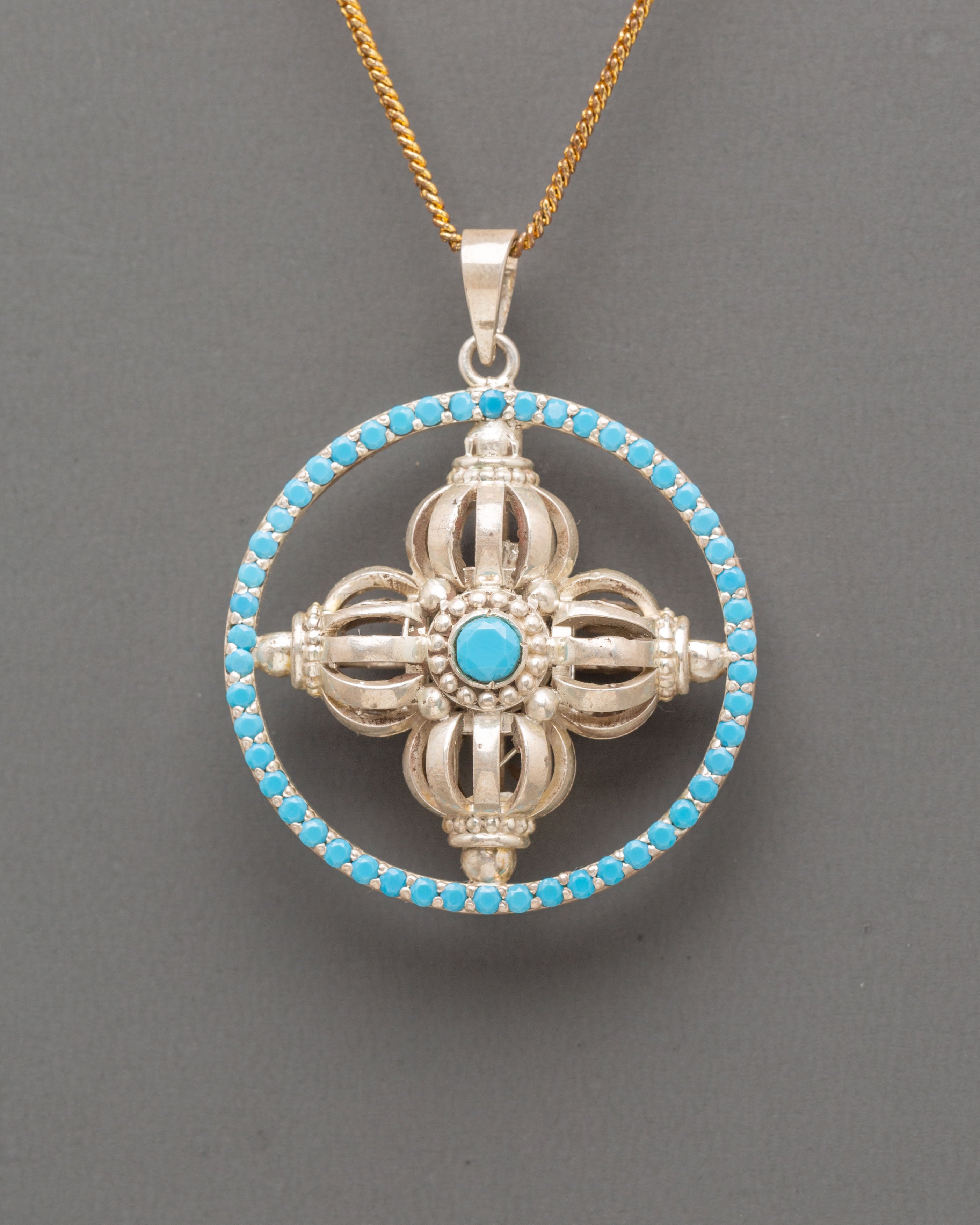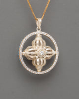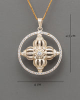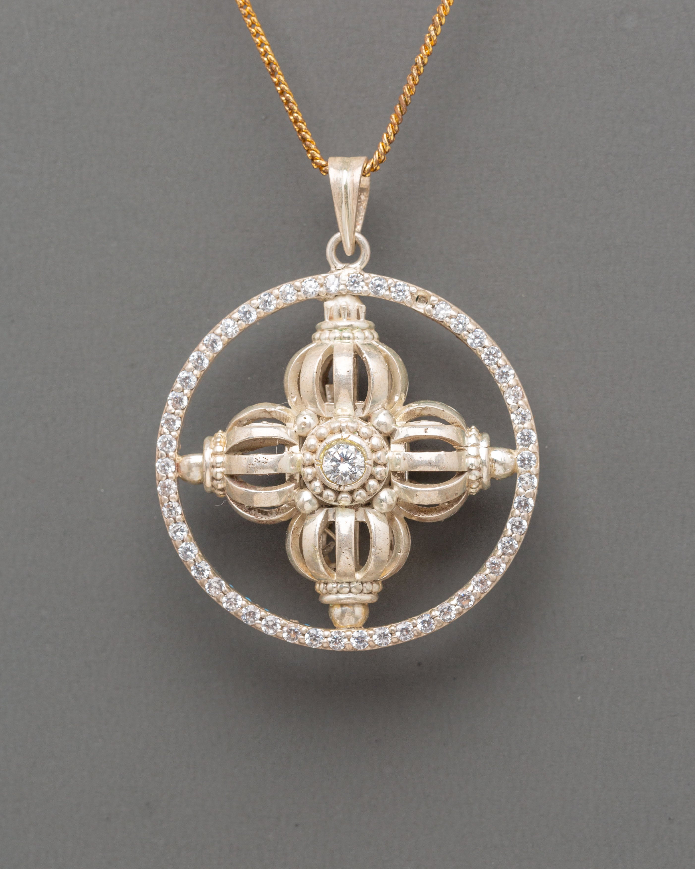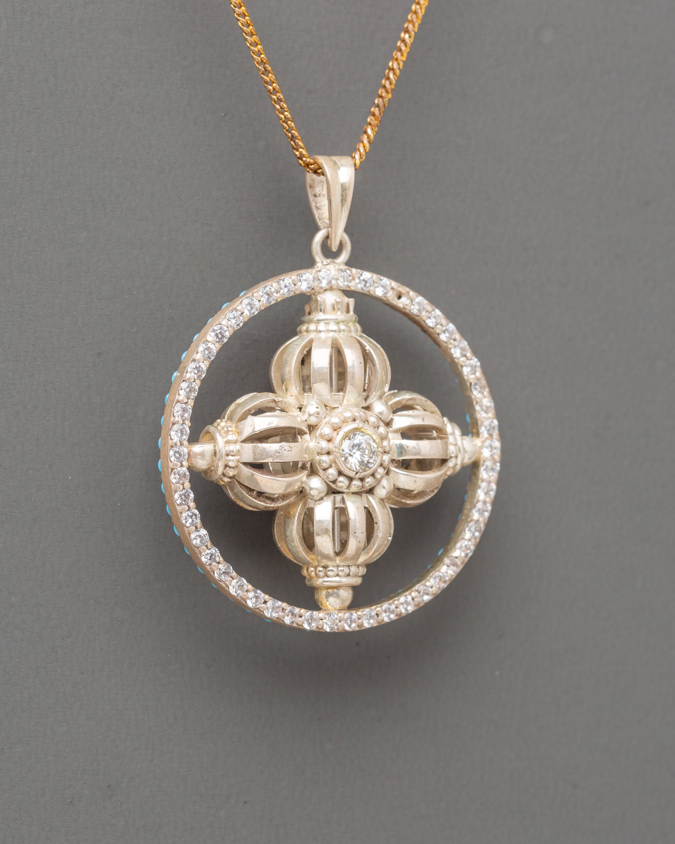 The Bishow Vajra Locket for Accessories is a gorgeous piece of sacred art made of 92.5 sterling silver, representing the indestructible strength of spiritual truth. Inspired by the Tibetan Dorje or Vajra, this necklace symbolizes balance, unification, and the unstoppable spirit of enlightenment. The circular frame, encrusted with beautiful crystal-like stones, complements the central Vajra pattern, symbolizing the unbreakable tie between wisdom and compassion, two essential principles in Tibetan Buddhism.