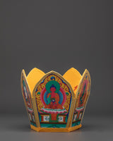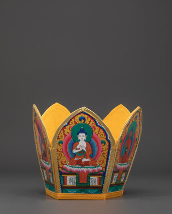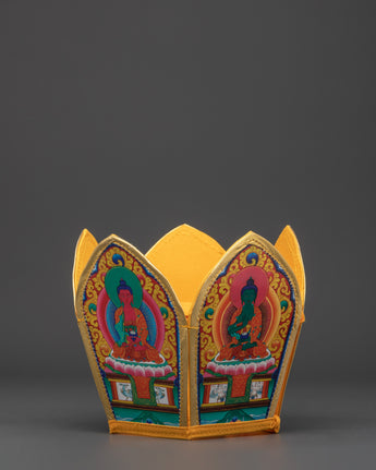 This ceremonial crown is lightweight and flexible, having been handcrafted from cotton with beautiful brocade detailing. It is 49cm in breadth and weighs only 0.098 kilogram, making it ideal for wearing or displaying on a shrine. Each panel is bordered with yellow borders and embellished with religious symbolism inspired by thangka art, resulting in a visually stunning and spiritually powerful sculpture. Whether used at a monastery, personal altar, or during an empowerment ritual, this crown holds both cultural and spiritual significance.