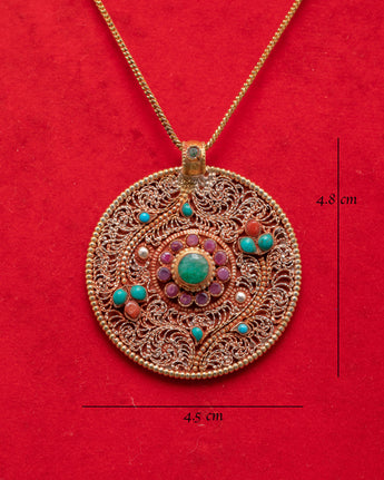 This Flower Locket of Panna is an exquisite piece of jewelry, crafted from silver and plated with gold for a refined, elegant finish. Adorned with panna (emerald), coral, and turquoise stones, this pendant combines beauty with powerful spiritual energy. Measuring 4.8cm in height and 4.5cm in width, this flower-shaped locket symbolizes growth, prosperity, and protection.