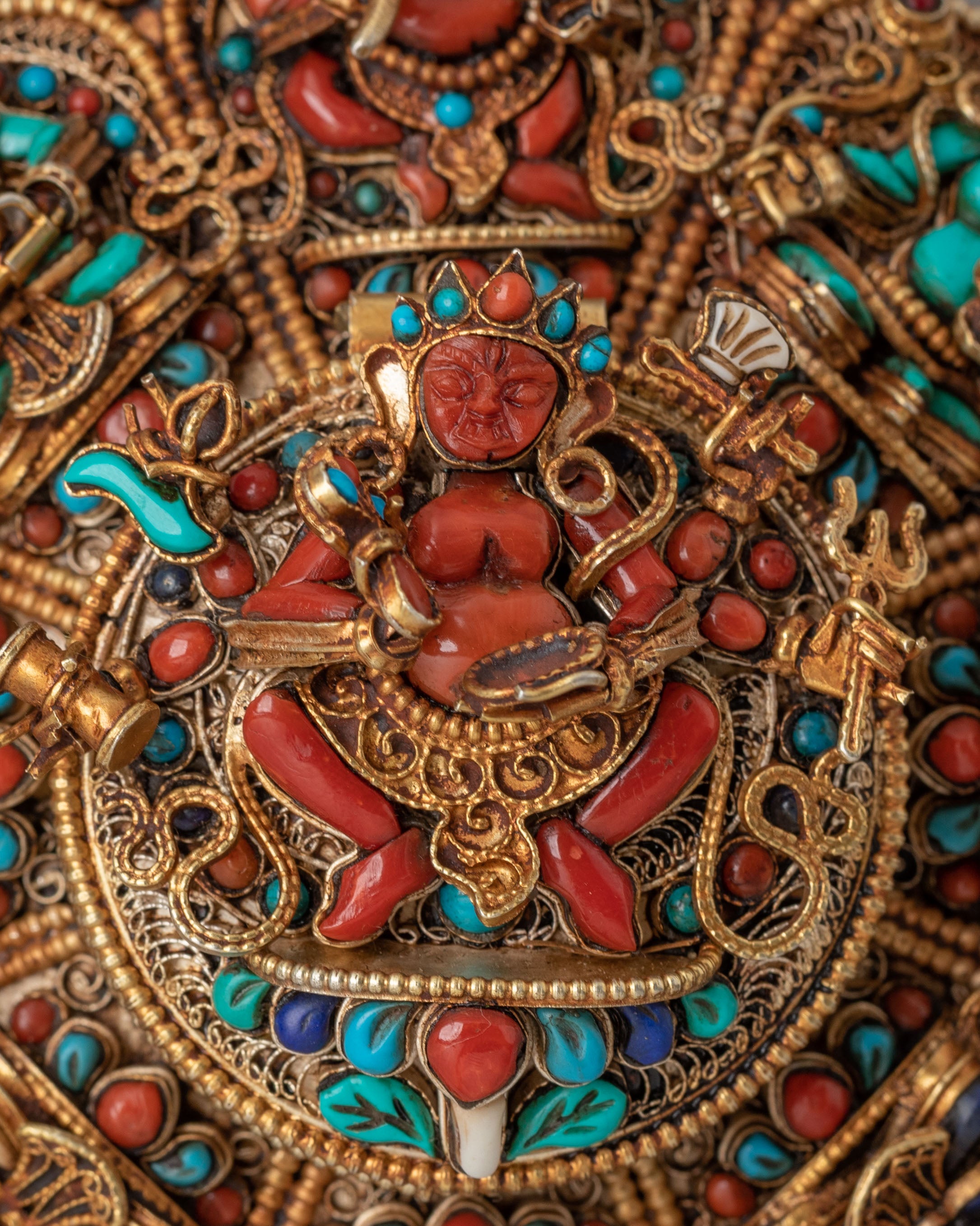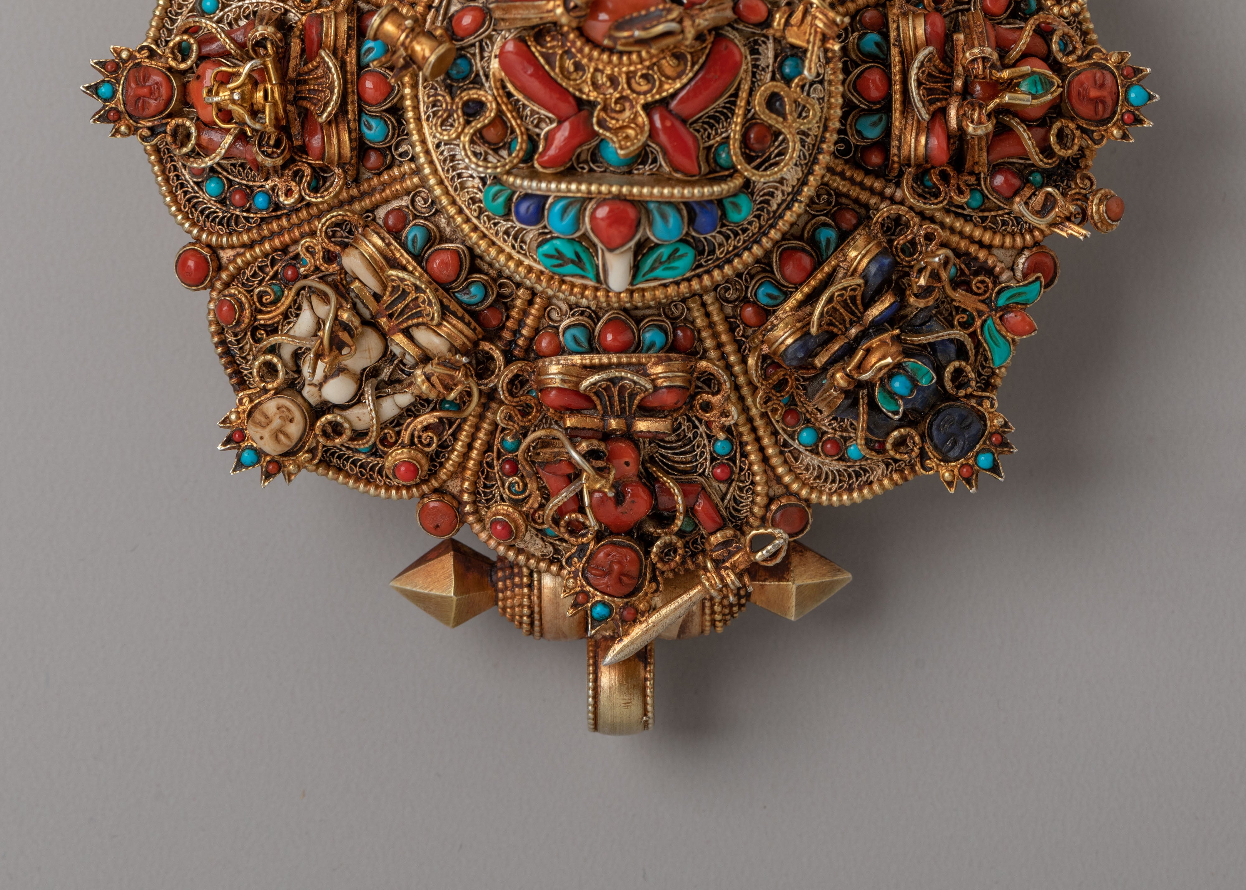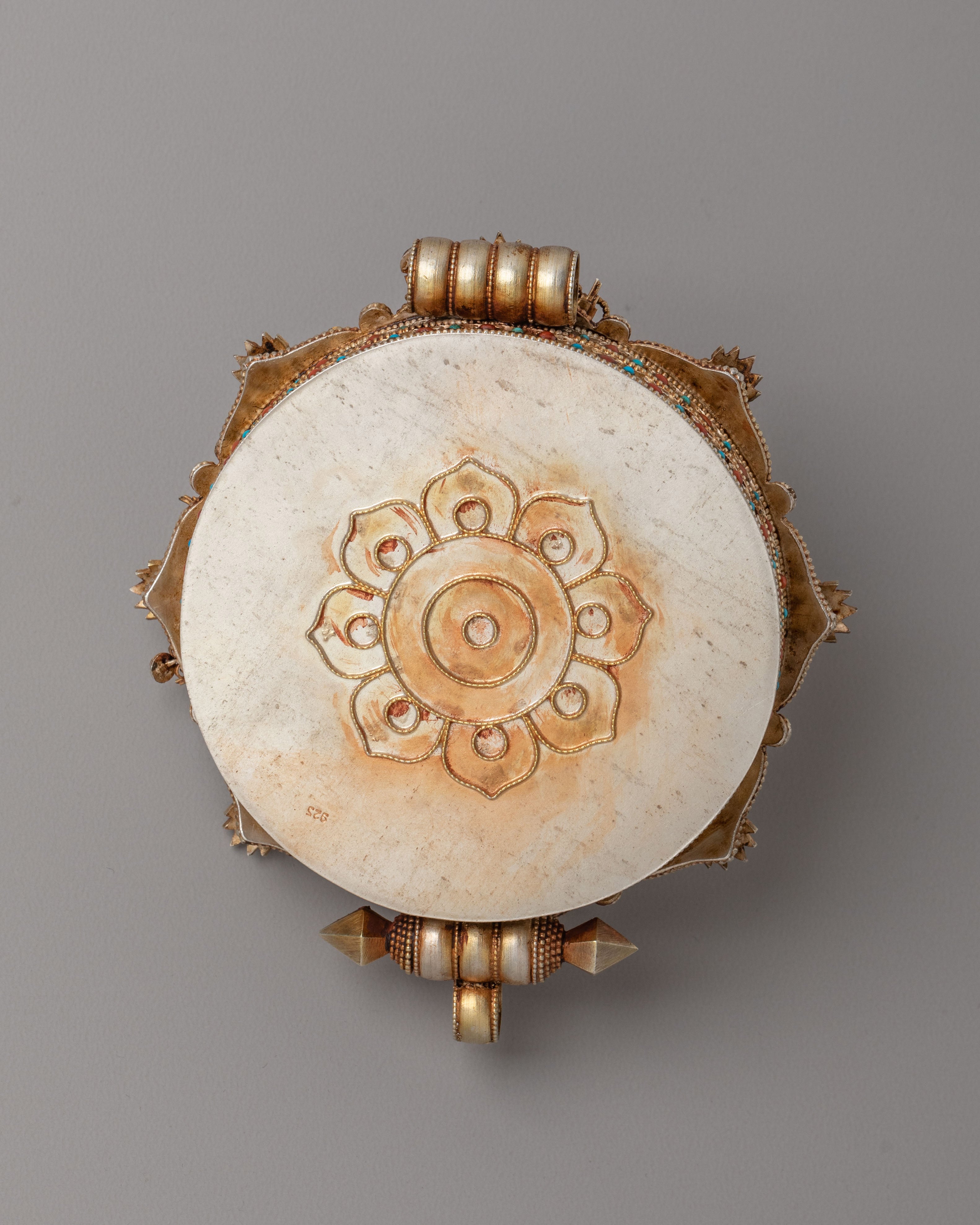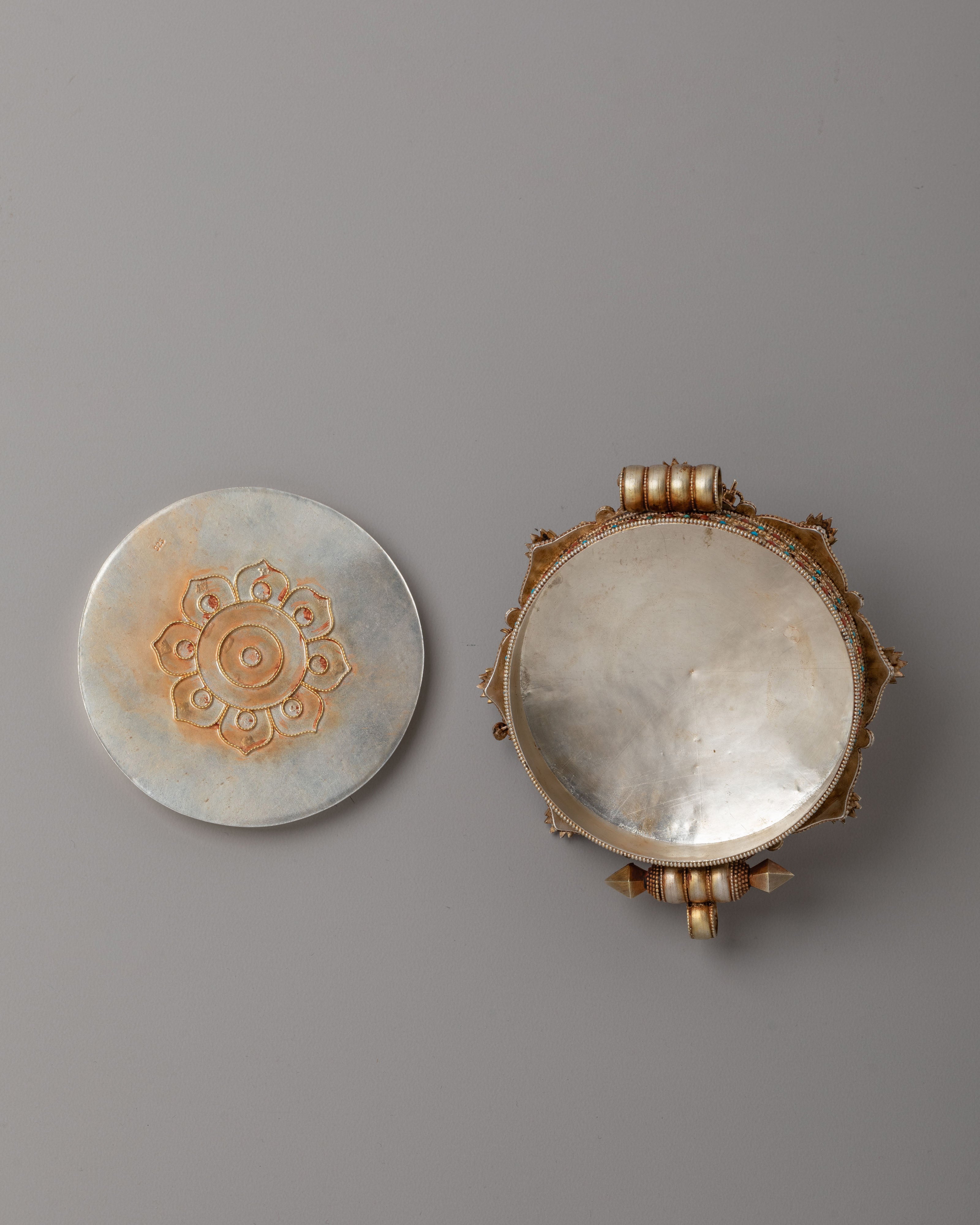 The Ghau box locket is meticulously crafted, featuring vibrant gemstones that enhance the spiritual energy of the piece. The lapis lazuli symbolizes wisdom, turquoise brings healing and tranquility, and coral signifies protection. Together, they form a powerful combination of spiritual energy, making this locket a meaningful amulet for anyone seeking spiritual growth and guidance.