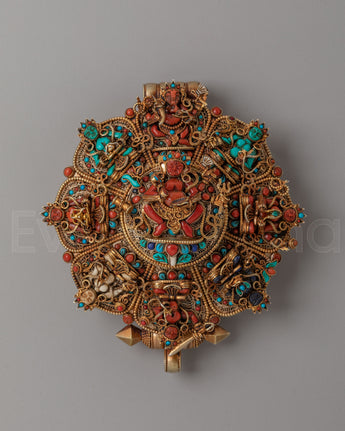 This Ghau Box Locket with Deities is a stunning piece of spiritual craftsmanship, intricately designed with a blend of 92% silver, copper, and hand-carved gemstones such as lapis lazuli, turquoise, and coral. At its center, you'll find a detailed representation of Dzambhala, the deity of wealth and prosperity, surrounded by iconic Buddhist figures such as Amitabha Buddha, Amitayus, Chenrezig, Akshovya Buddha, White Tara, Manjushri, Green Tara, and Ganesh. These deities are carefully depicted in fine detail, each representing different aspects of protection, wisdom, and spiritual abundance.