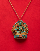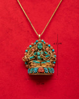 The goddess of compassion, Green Tara Locket, is a magnificently carved Tibetan pendant that represents the compassion and protection of Green Tara, one of Tibetan Buddhism's most cherished deities. This locket is crafted from silver with gold plating and measures 4.5cm in height and 3.5cm in breadth, weighing just 0.016kg. It provides a spiritual elegance. The locket is embellished with coral and turquoise stones, each carefully selected for its healing properties and connection to Tara's energy.