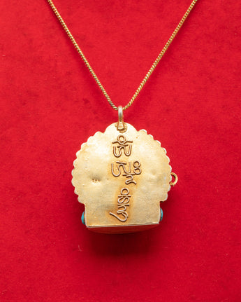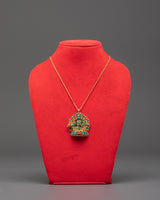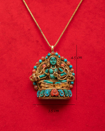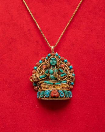 This Green Tara locket features a beautifully crafted image of Tara in a serene, contemplative pose, representing compassion, wisdom, and protection. Coral stones are believed to symbolize power, while turquoise rocks are associated with healing and spiritual harmony. The gold plating accentuates the pendant's religious significance, making it both a spiritually meaningful and aesthetically pleasing piece of jewelry. Green Tara's serene facial expression embodies universal compassion, providing the wearer with a sense of calm and spiritual clarity.