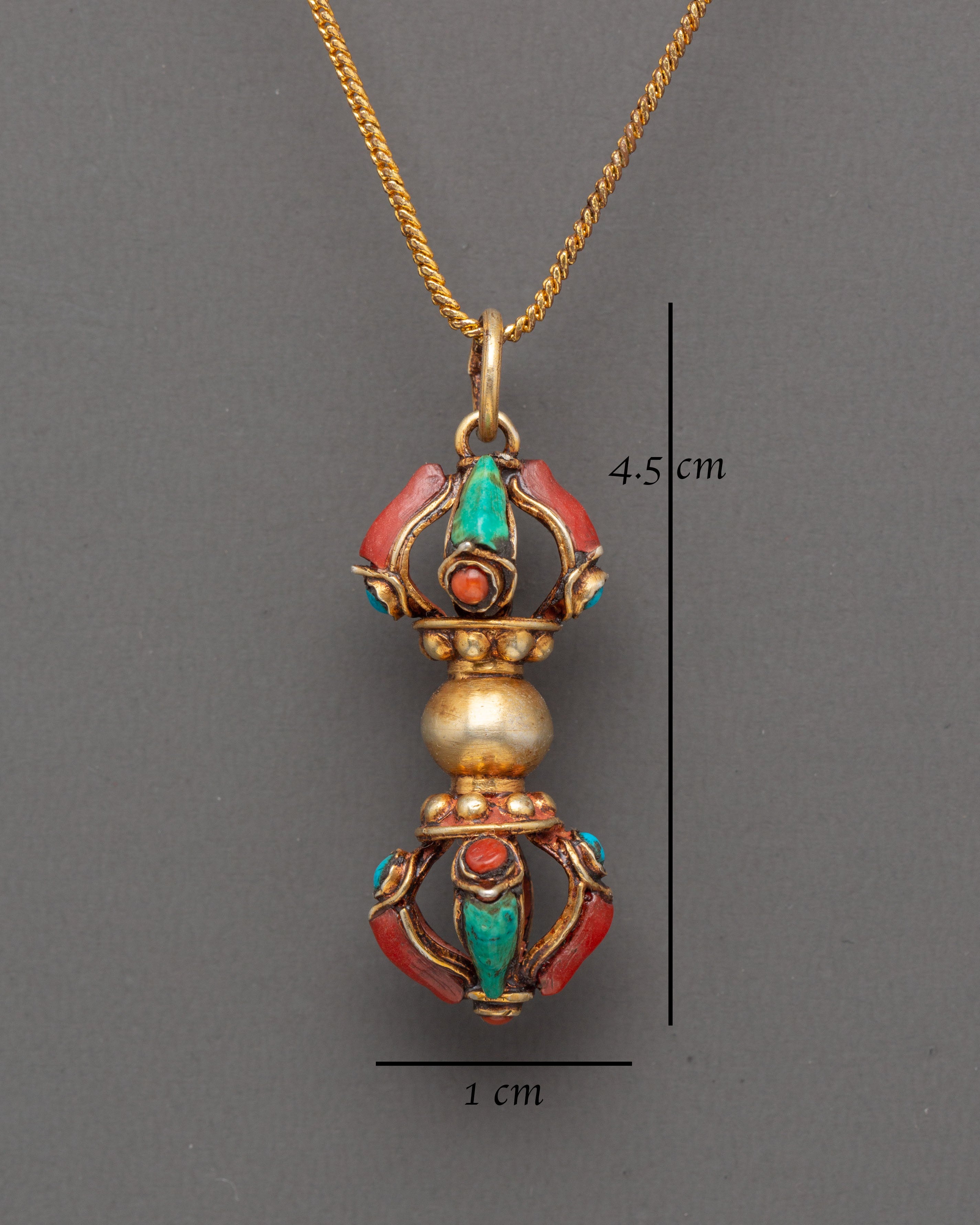 Measuring 4.5cm in height and 1cm in width, the locket weighs just 0.008kg, making it a lightweight yet impactful accessory. Crafted from 92.5 silver, it exudes a radiant shine that beautifully contrasts with the vibrant turquoise and coral stones. The gold plating ensures that the piece retains a rich, elegant finish, making it a perfect addition to any spiritual collection. Whether worn as part of your daily attire or kept as a sacred talisman, this locket serves as a reminder of the strength and protection symbolized by the Vajra Dorje.