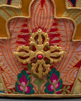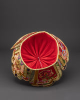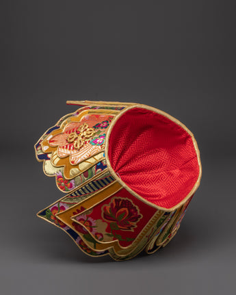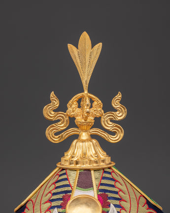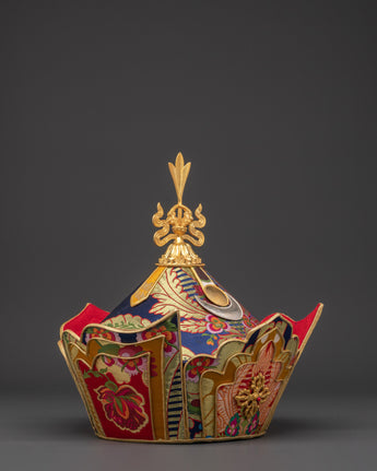 The crown is made of a copper body that has been electrogold-plated for a beautiful sheen and a spiritual glow. Wrapped in beautiful Banarasi fabric, it features traditional floral and symbolic designs that showcase the intricate craftsmanship of Tibetan workmanship. The top finial is adorned with a vajra emblem, representing the unwavering clarity and power of the enlightened mind. At 0.70 kg, it is significant but manageable, designed for both practitioners and collectors.