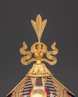 This Handcrafted Tibetan Ritual Crown is a precious ceremonial headdress utilized in traditional Buddhist ceremonies, including rituals and empowerments. This crown, with a stunning height of 33 centimeters and a wide diameter of 32 centimeters, has been designed to convey both visual presence and spiritual significance. The crown ring is 19 centimeters, making it excellent for ceremonial or symbolic altar display.