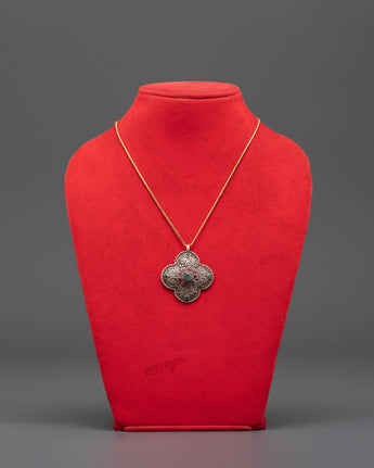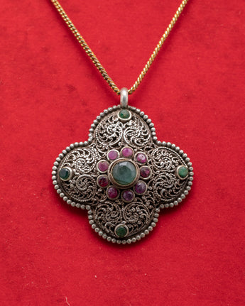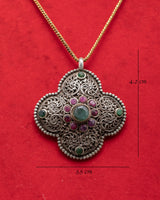 This exquisite handmade filigree silver locket showcases the elegant artistry of traditional metalwork, featuring an ornate quatrefoil design that symbolizes good fortune and spiritual protection. The intricate filigree patterns are meticulously crafted by skilled artisans, creating delicate scrollwork and botanical motifs that dance across the silver surface. At the heart of this stunning pendant lies a mesmerizing arrangement of artificial panna (emerald) and ruby stones, with a central emerald surrounded by six ruby gems that create a captivating floral mandala. The gold-plated accents highlight the finest details of the filigree work, while tiny pearl-like beading around the perimeter adds an elegant finishing touch to this heirloom-quality piece.