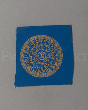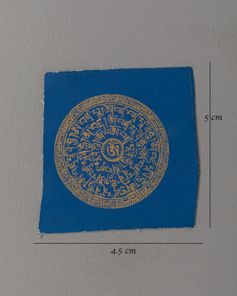 This Tibetan Mantra Mandala for Locket measures 5 cm in height and 4.5 cm in width. It is hand-painted on cotton canvas using acrylic colors and finished with 24k gold . The size makes it suitable for wearing inside a locket, carrying in a pocket, or placing on a small personal altar for daily spiritual use.