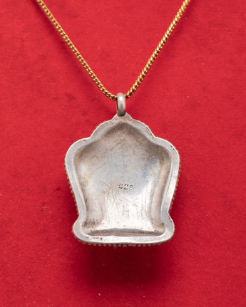The floral motifs in this traditional pendant represent growth, renewal, and the flourishing of life, making it a meaningful symbol of prosperity and natural harmony. Each flower pattern has been meticulously handcrafted by skilled artisans who understand the sacred significance of botanical imagery in jewelry design, where blooms symbolize feminine grace, beauty, and the cycle of life. The shield-like silhouette adds a regal quality to this ornate silver pendant. At the same time, the combination of emerald and ruby stones creates a captivating color palette that catches light from every angle. This handmade silver flower motif pendant weighs 6 grams, providing a substantial feel that speaks to its quality construction and premium materials, making it perfect for those who appreciate traditional filigree jewelry, ornate floral designs, and artisan-crafted silver pendants with gemstone accents.