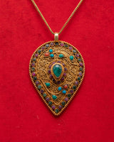 This Tibetan Ruby Locket with Gold Plating is a stunning spiritual accessory, expertly crafted from silver and plated with gold for a radiant finish. Adorned with a ruby stone, this pendant is not only a beautiful piece of jewelry but also a powerful symbol of protection, vitality, and prosperity. Measuring 5.5cm in height and 3.7cm in width, this locket is the perfect size for both daily wear and special occasions.
