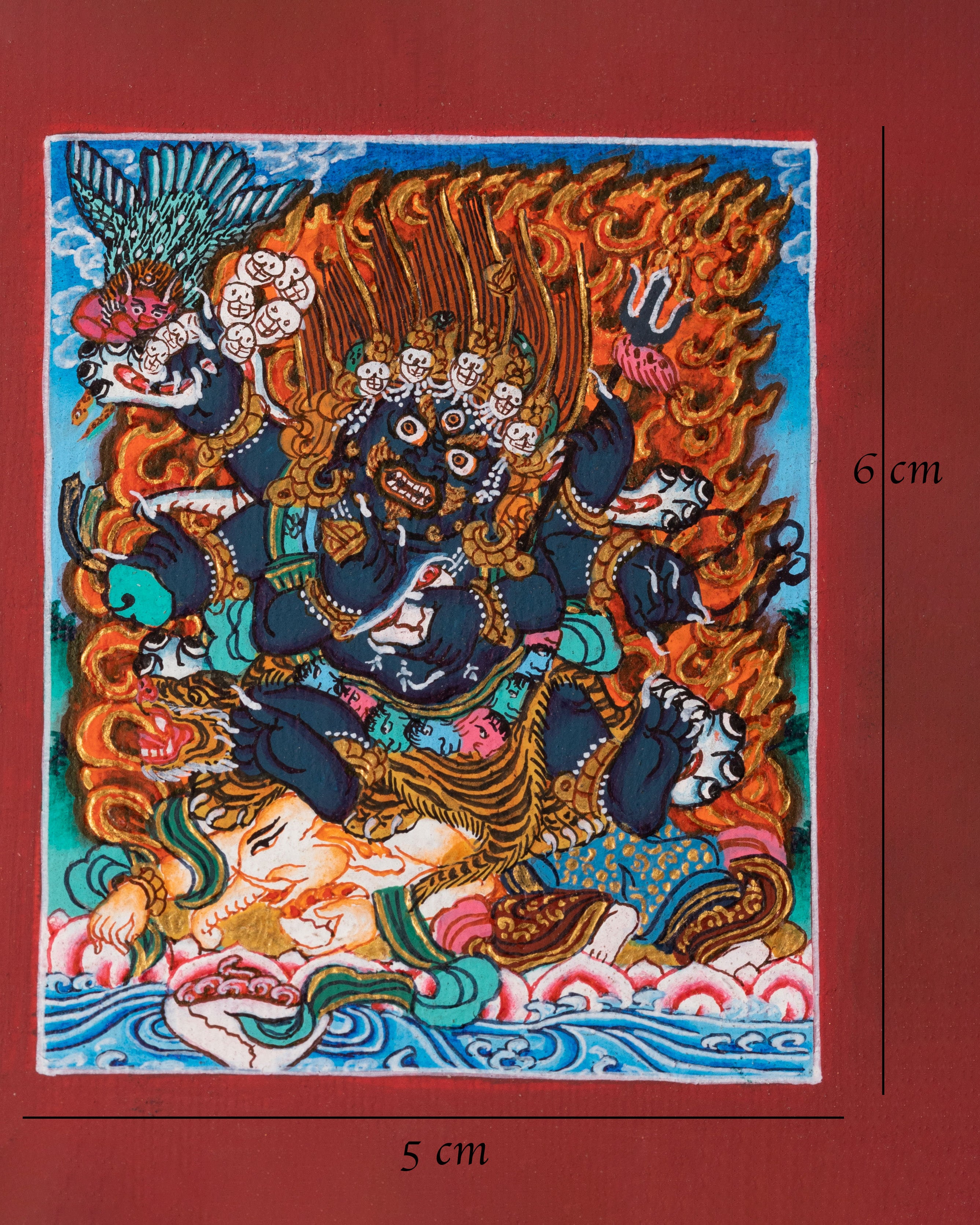 The Six-Armed Mahakala Thangka for Locket is a powerful miniature sacred artwork representing supreme protection, fearlessness, and enlightened action. Hand-painted on cotton canvas using acrylic colors and finished with 24k gold detailing, this thangka measures 6cm in height and 5cm in width, making it perfectly suited for lockets, portable shrines, or sacred jewelry settings. Each piece is crafted using traditional Tibetan thangka painting techniques, ensuring authenticity, precision, and spiritual depth.