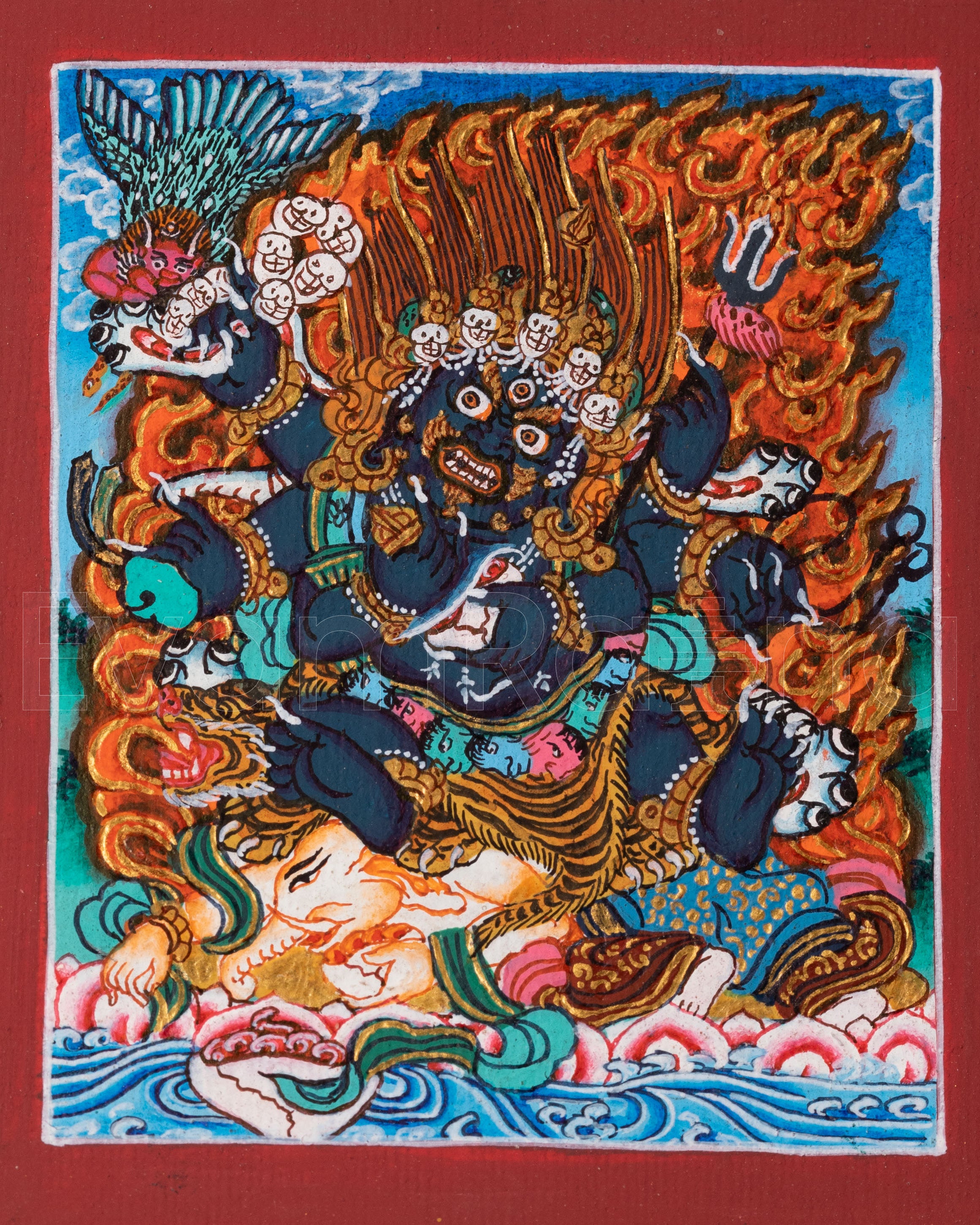This thangka depicts Six-Armed Mahakala, one of the most revered wrathful protector deities in Vajrayana Buddhism. The six arms symbolize swift and powerful enlightened activity, while Mahakala’s fierce expression represents the complete destruction of ignorance, ego, and all inner and outer obstacles.