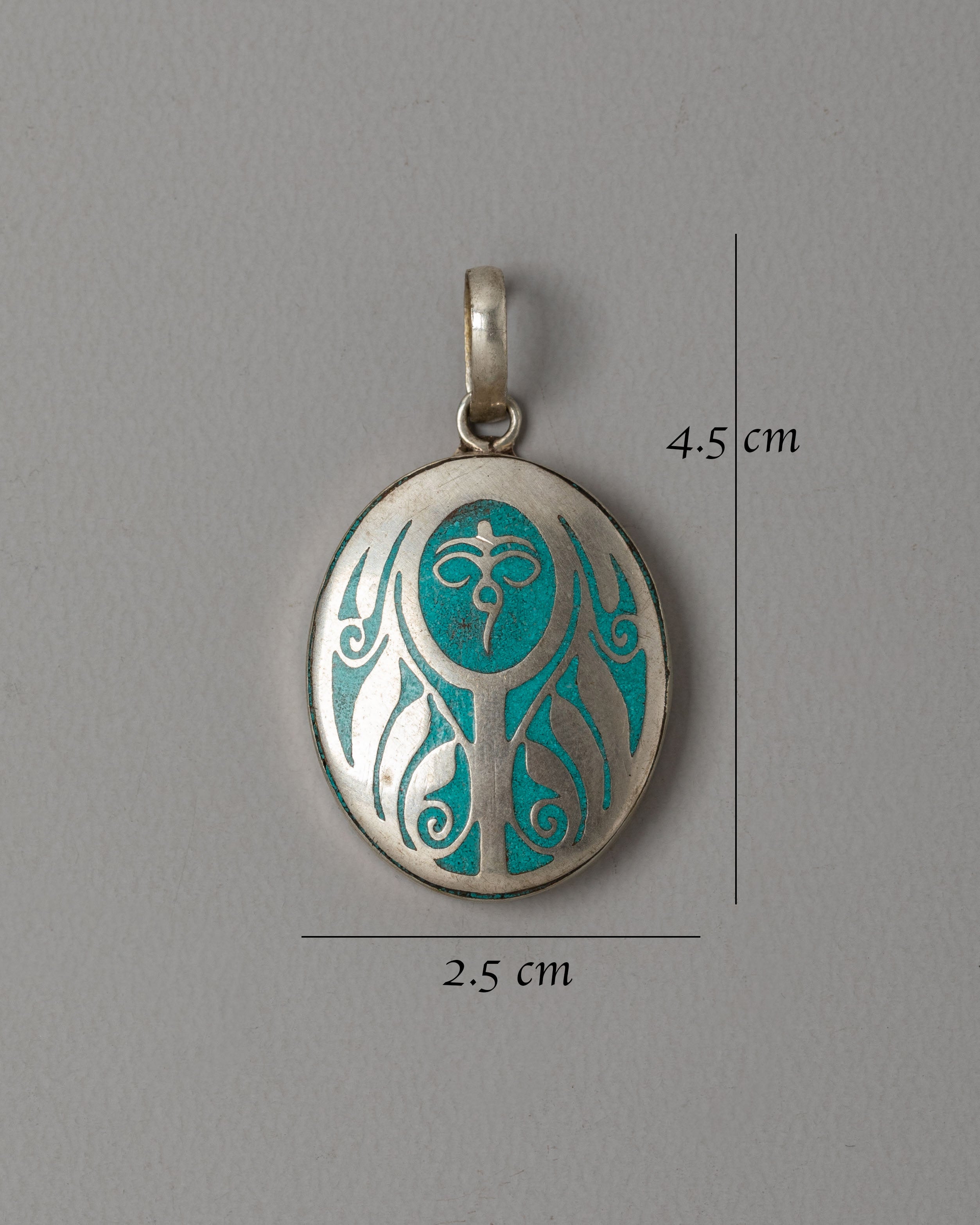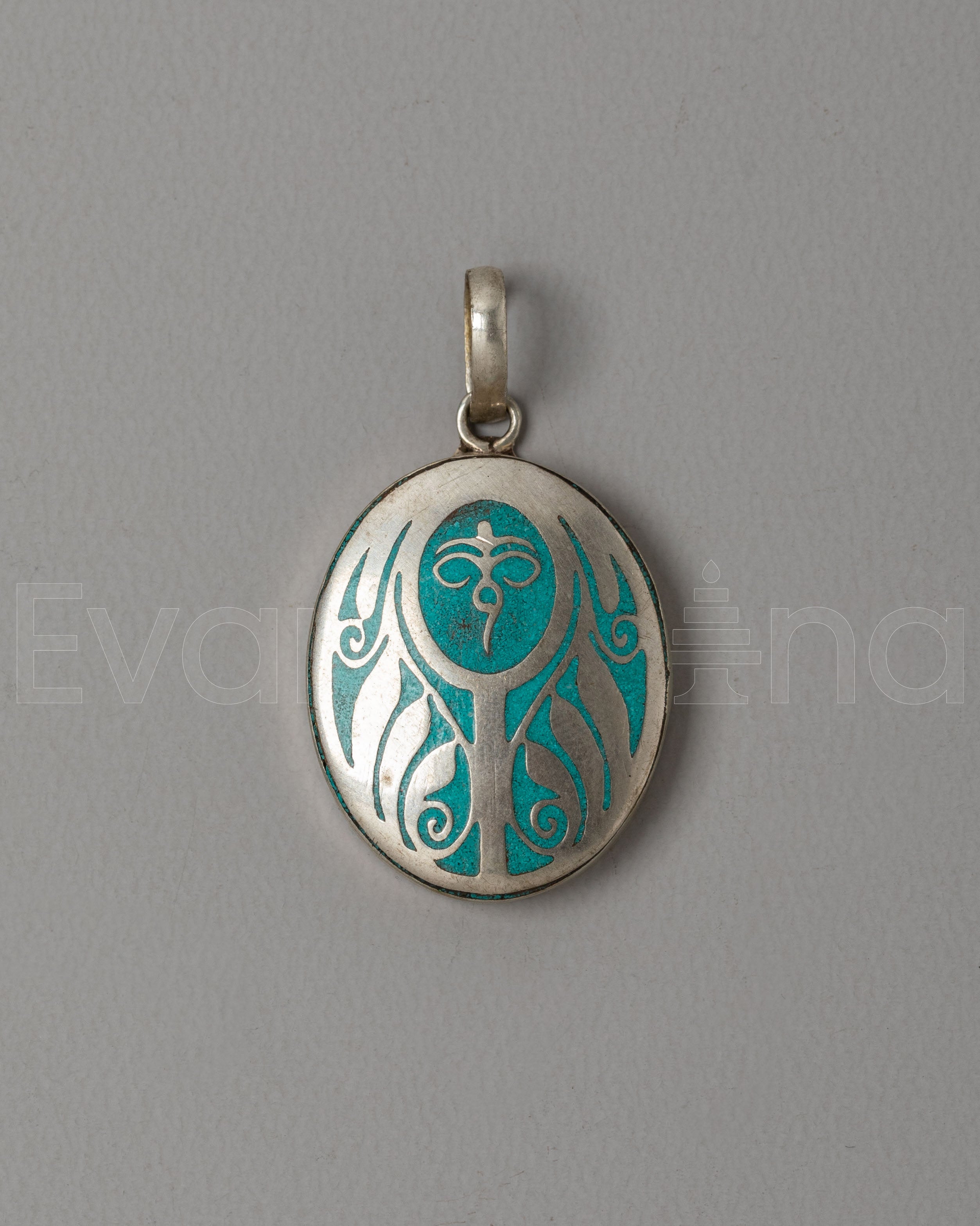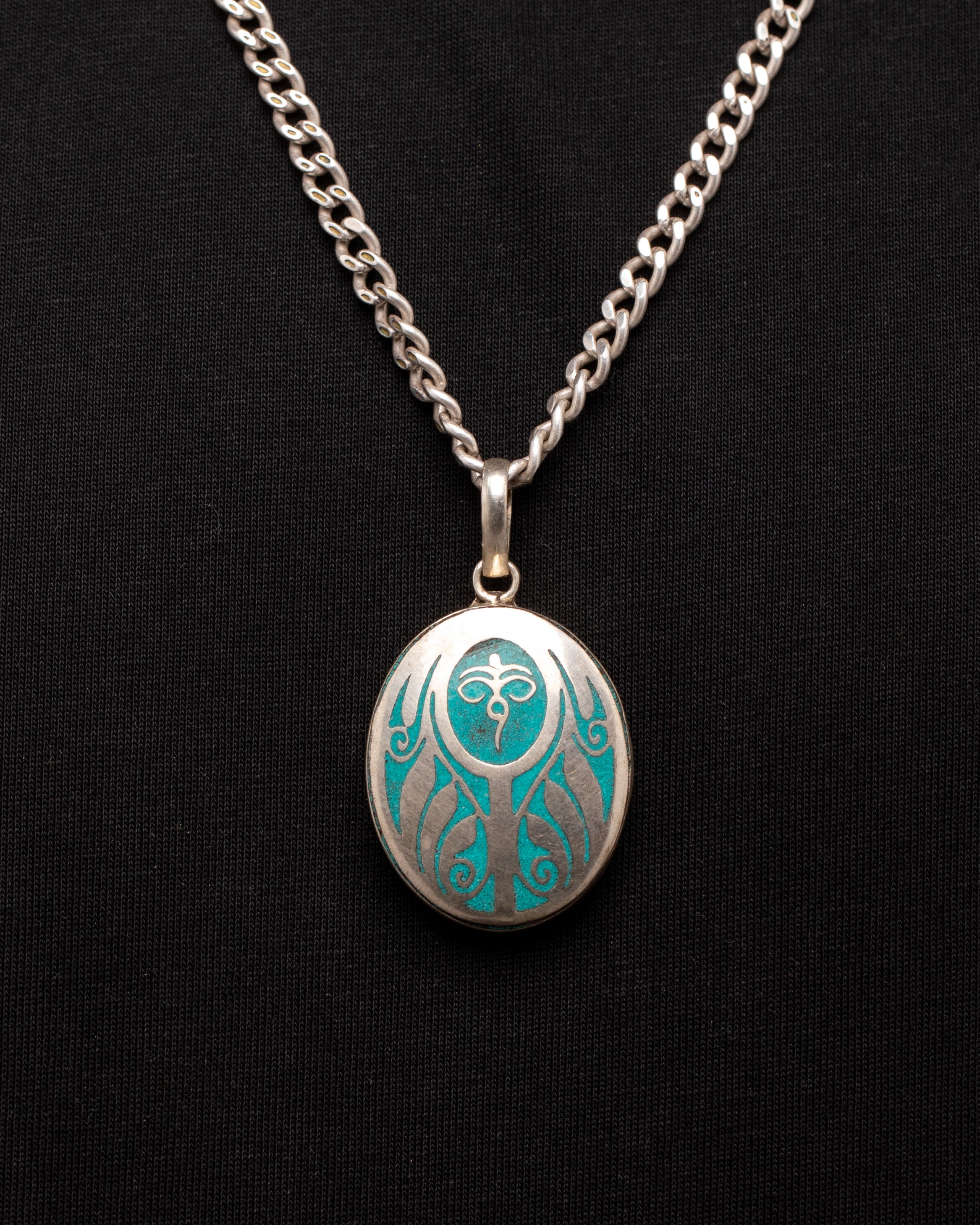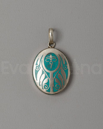 The design of the pendant is inspired by traditional spiritual symbols that represent the interconnectedness of all things. The gentle curves and shapes in the design evoke a sense of flow and unity, while the turquoise coloring adds a vibrant touch that is said to promote tranquility and healing. This pendant serves as a reminder to stay connected to one's spiritual path, encouraging calmness, balance, and reflection throughout life's journey.