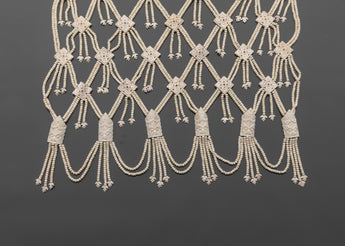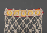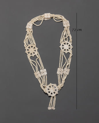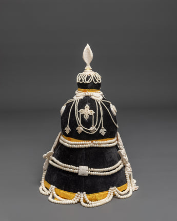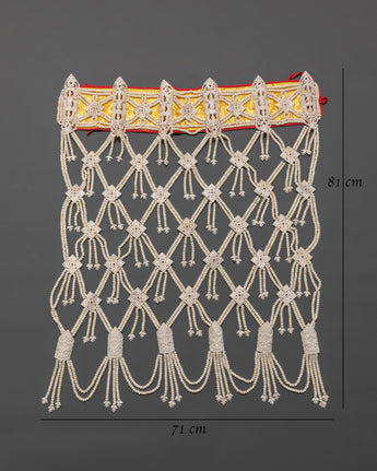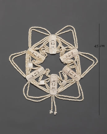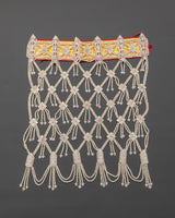 The Crown, 36.5cm tall and 21cm wide, represents heavenly protection and serves as the set's centerpiece. The Chowker Necklace (45cm x 45cm) is designed to align with energy centers during meditation, while the Armlets (10cm x 24cm) facilitate the wearer's spiritual energy flow. The Long Necklace (72cm x 72cm) is designed to emphasize the power of invocation, with its length creating a strong connection to religious rites. The Apron (81cm x 71cm) completes the set, providing full ritual apparel at a weight of 2.24kg, representing the balance and elegance required for deep spiritual participation.