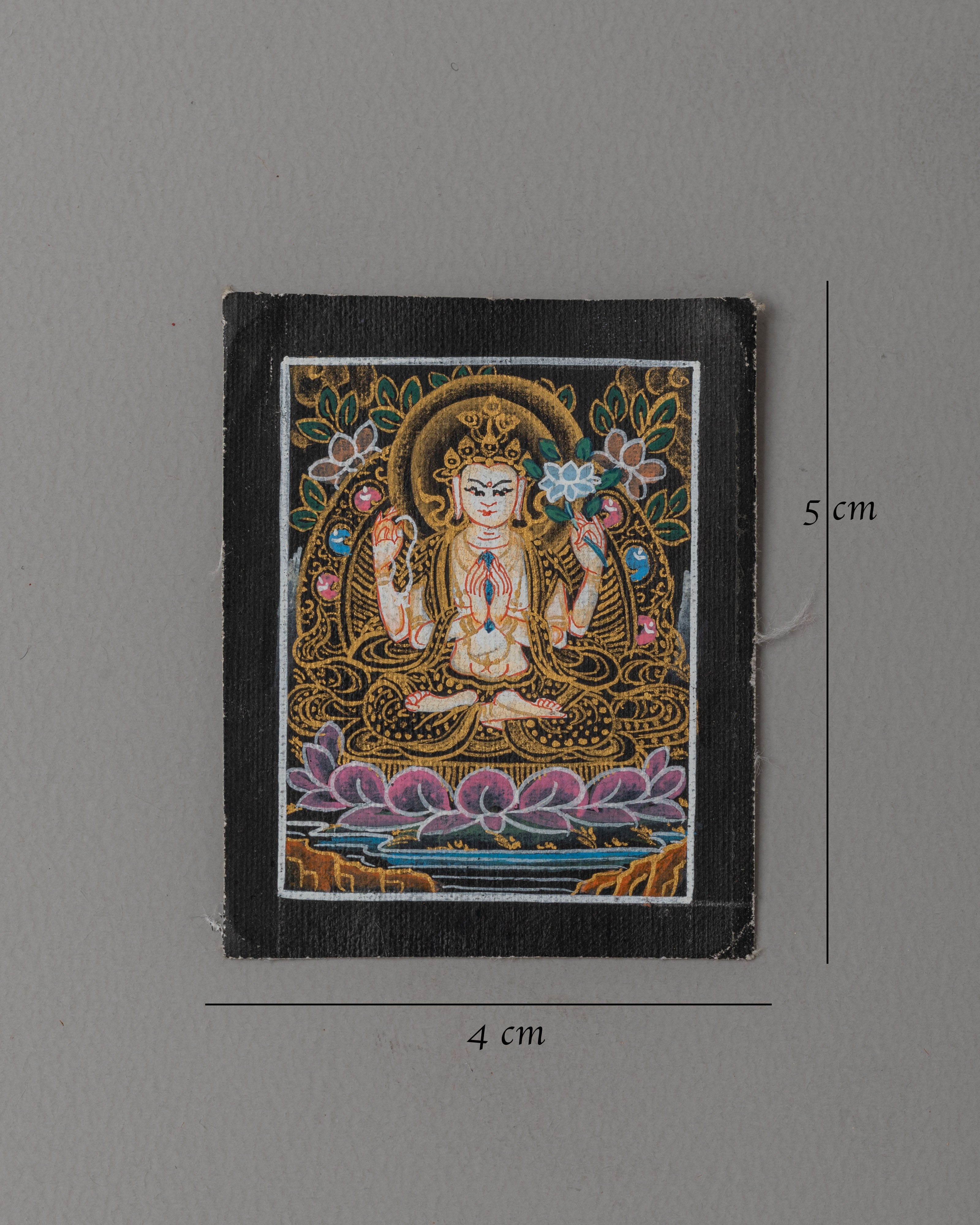 This Handcrafted Tibetan Chenrezig Thangka for Locket measures 5 cm in height and 4 cm in width. It is painted on cotton canvas using acrylic colors with 24k gold, making it a miniature piece of sacred Tibetan artwork. Its compact size makes it ideal for wearing as a locket, carrying in a pocket, or placing on a personal altar for meditation, prayer, or daily spiritual practice.