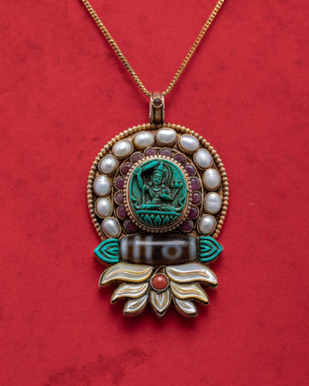 The Dzi stones are highly regarded in Tibetan tradition for their association with protection and positive energy. The inclusion of pearl and turquoise further enhances the pendant’s symbolism of purity and spiritual insight. The coral accents offer a grounding and calming effect. Every detail, from the vibrant gemstones to the intricate silver and gold elements, has been carefully chosen to reflect profound meaning and the pursuit of wisdom. This locket encapsulates a powerful spiritual narrative, blending beauty with tradition.
