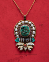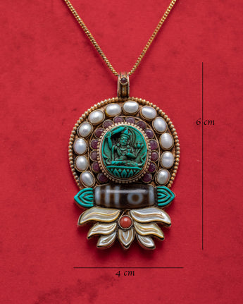 This Tibetan Manjushri pendant locket is a remarkable spiritual piece, thoughtfully crafted from silver and gold-plated materials. Standing at 6 cm in height and 4 cm in width, it serves as both an ornamental and symbolic accessory. At the heart of the pendant is an exquisitely carved depiction of green Manjushri, the Bodhisattva of wisdom, surrounded by a detailed arrangement of Dzi stones, pearls, coral, and turquoise. The design reflects the rich culture and spiritual heritage of Tibet, making it a meaningful item to wear or gift.