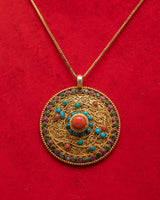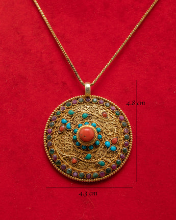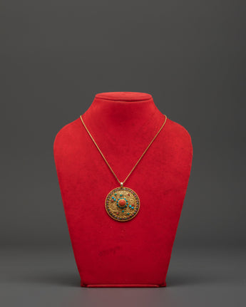 This Tibetan Ruby Locket is a beautifully crafted piece of jewelry made from silver and gold-plated for a finish. Adorned with ruby, panna (emerald), coral, and turquoise stones, this pendant is designed to offer a harmonious balance of vitality, wisdom, protection, and spiritual growth. Measuring 4.8cm in height and 4.3cm in width, this locket combines elegance with meaningful energy.