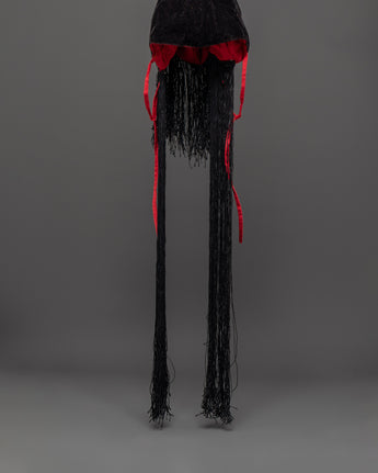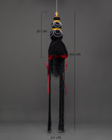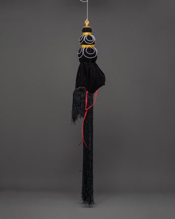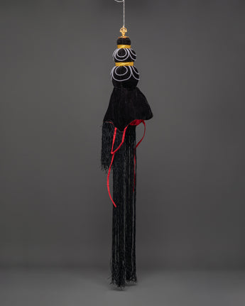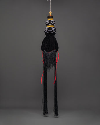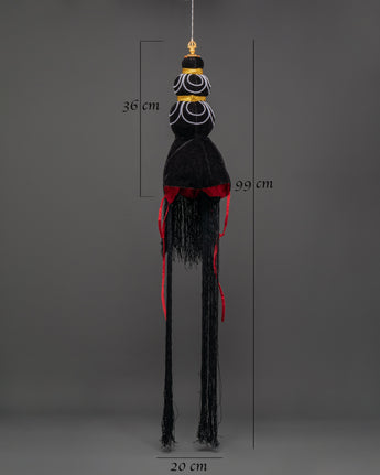 The crown is 36cm in central body height and has a total vertical length of 99cm, including the flowing black tail and ornamental crimson lining. This elaborate Buddhist headdress was created with ceremonial intent and is typically worn by high lamas and practitioners during tantric initiations, empowerments, and activities involving protector deities. The use of cloth, gold-toned copper, and symbolic items improves the ritual's authenticity and spiritual air.