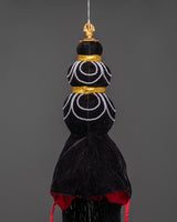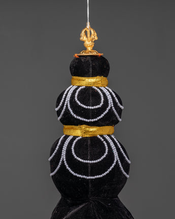 This Traditional Black Vajrayana Crown is a precious Tibetan ceremonial headgear, meticulously crafted for use in elegant Tantric and Vajrayana Buddhist rituals. This crown, crafted from exquisite black velvet fabric and adorned with beautiful white beading, embodies the profound symbolism of wisdom, power, and spiritual protection. The layers are topped with a gold-colored copper vajra (dorje), which in Tibetan philosophy represents unbreakable enlightenment and indestructible force.
