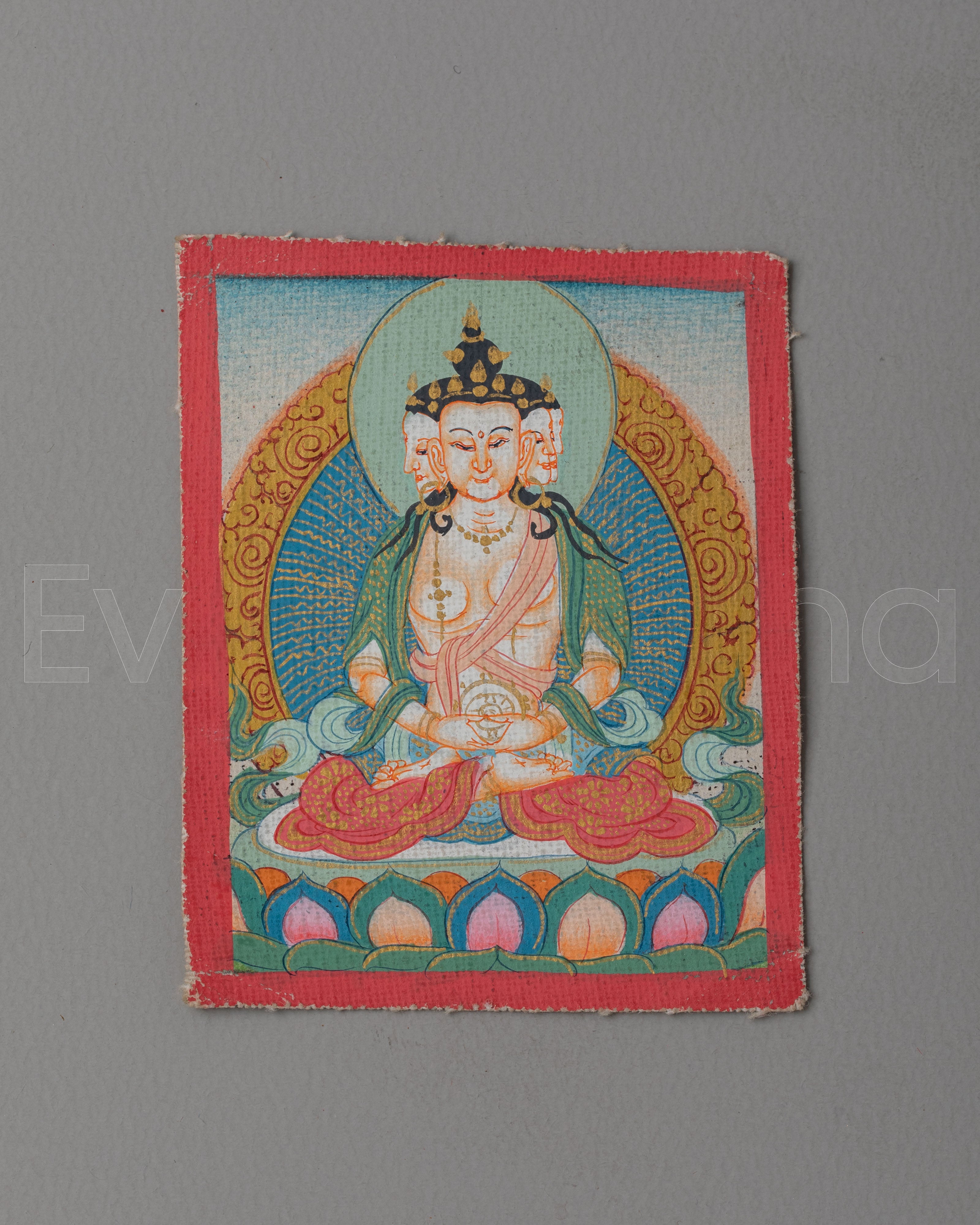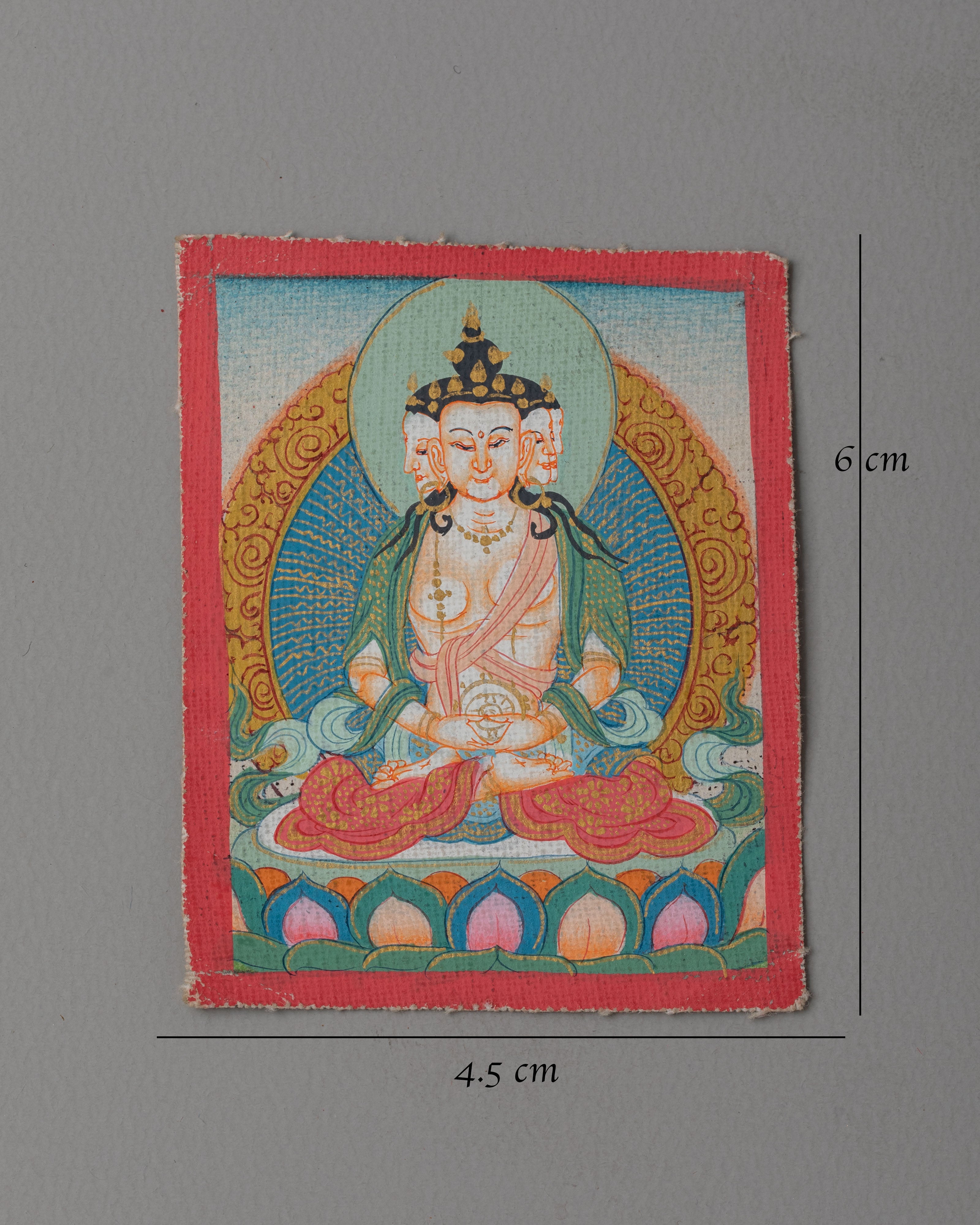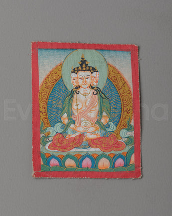 This Vairocana Thangka for Locket showcases a vibrant, intricately detailed artwork of Vairocana, a central figure in Mahayana Buddhism, symbolizing the wisdom and vastness of the universe. The image is delicately printed on cotton canvas and features 24K gold plating that enhances its sacred aura. Vairocana represents the universal mind, and this powerful locket brings peace, spiritual awakening, and enlightenment.