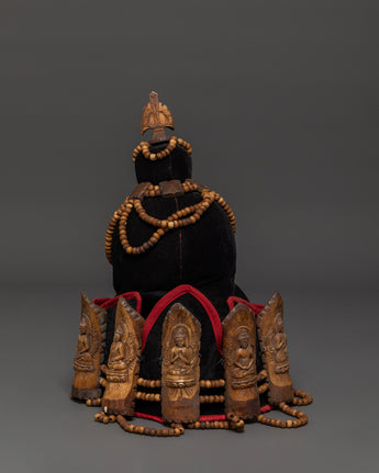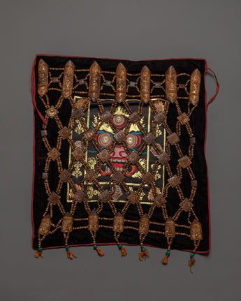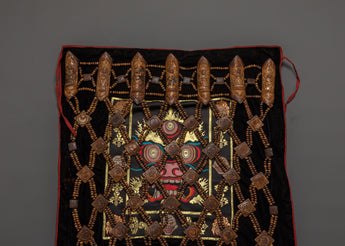 This Yak Bone Guru Fabric is a handcrafted Tibetan sacred cloth specifically designed to enhance your spiritual practices and altar decor. This special cloth, measuring 72 cm in height and 63 cm in width, exemplifies Tibetan workmanship and spirituality. The fabric features elaborate embellishments, including a crown, choker necklace, armlet, and apron, which represent traditional religious adornments worn during ceremonies. This cloth is ideal for meditation, prayer, and ritual decor, with a strong connection to Tibetan tradition and spiritual symbolism.