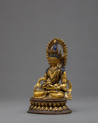 This statue art shows Amida also known as Amitayus Buddha in a seated posture magnificently. This statue is handcrafted in copper and gilded in 24K Gold. Buddhist Deity of Infinite Life is hand-carved in a serene face.
