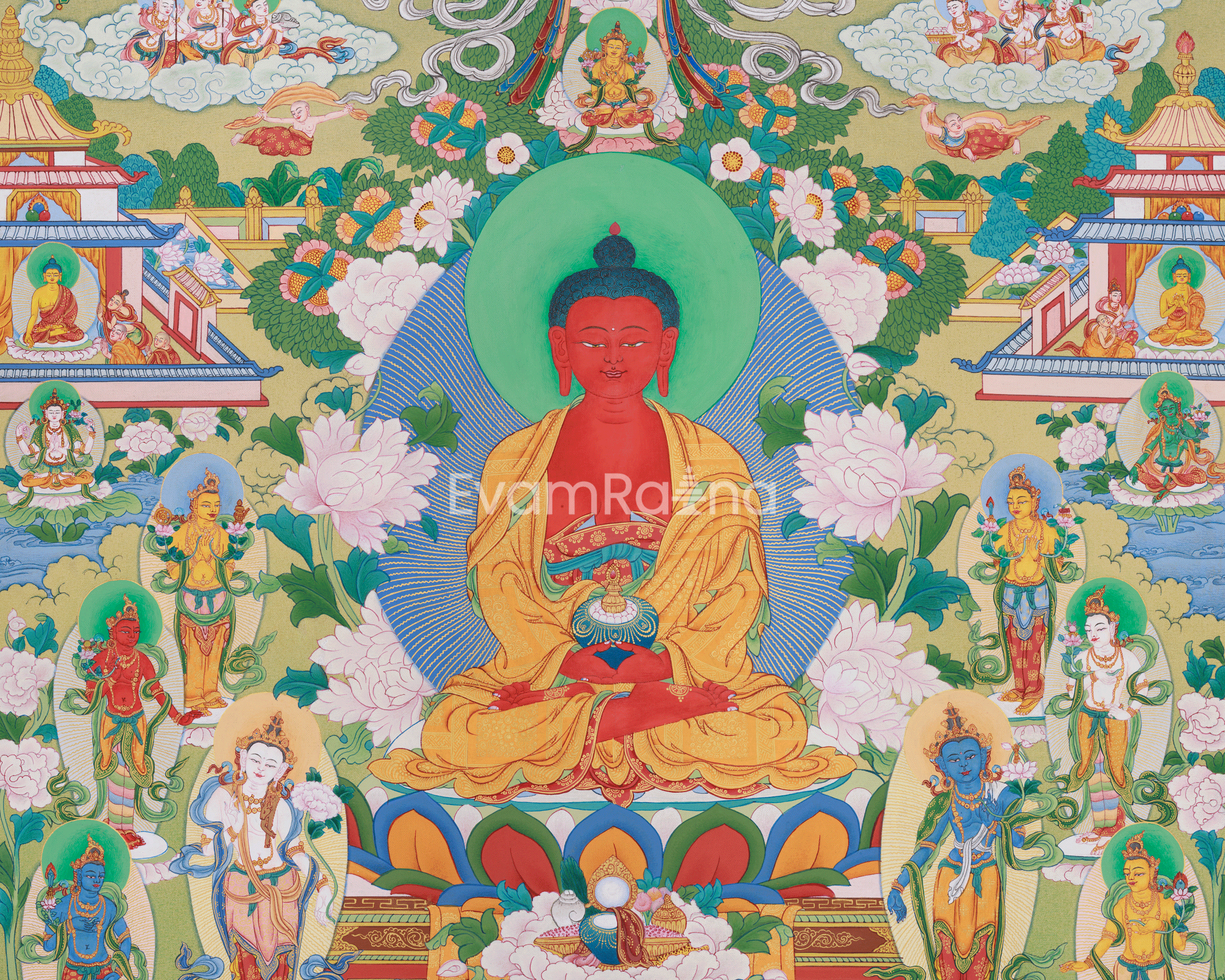In this thangka, Amitabha Buddha is shown seated on a brilliant lotus throne, holding a bowl of nectar—symbolizing his capacity to purify and heal all beings. Surrounding him is the magnificent depiction of Sukhavati, the Pure Land, featuring lush gardens, flowing rivers, and radiant lotus flowers. The Eight Bodhisattvas surround Amitabha, each offering their support to those on the path to liberation. The entire composition is not only a visual representation of Amitabha’s teachings but also a spiritual tool—created to inspire contemplation, meditation, and a deeper connection to the Buddha's compassionate energy and his Pure Land. Every detail of the painting invites the viewer to experience the peace and enlightenment Amitabha offers, creating a powerful presence of spiritual healing in your space.