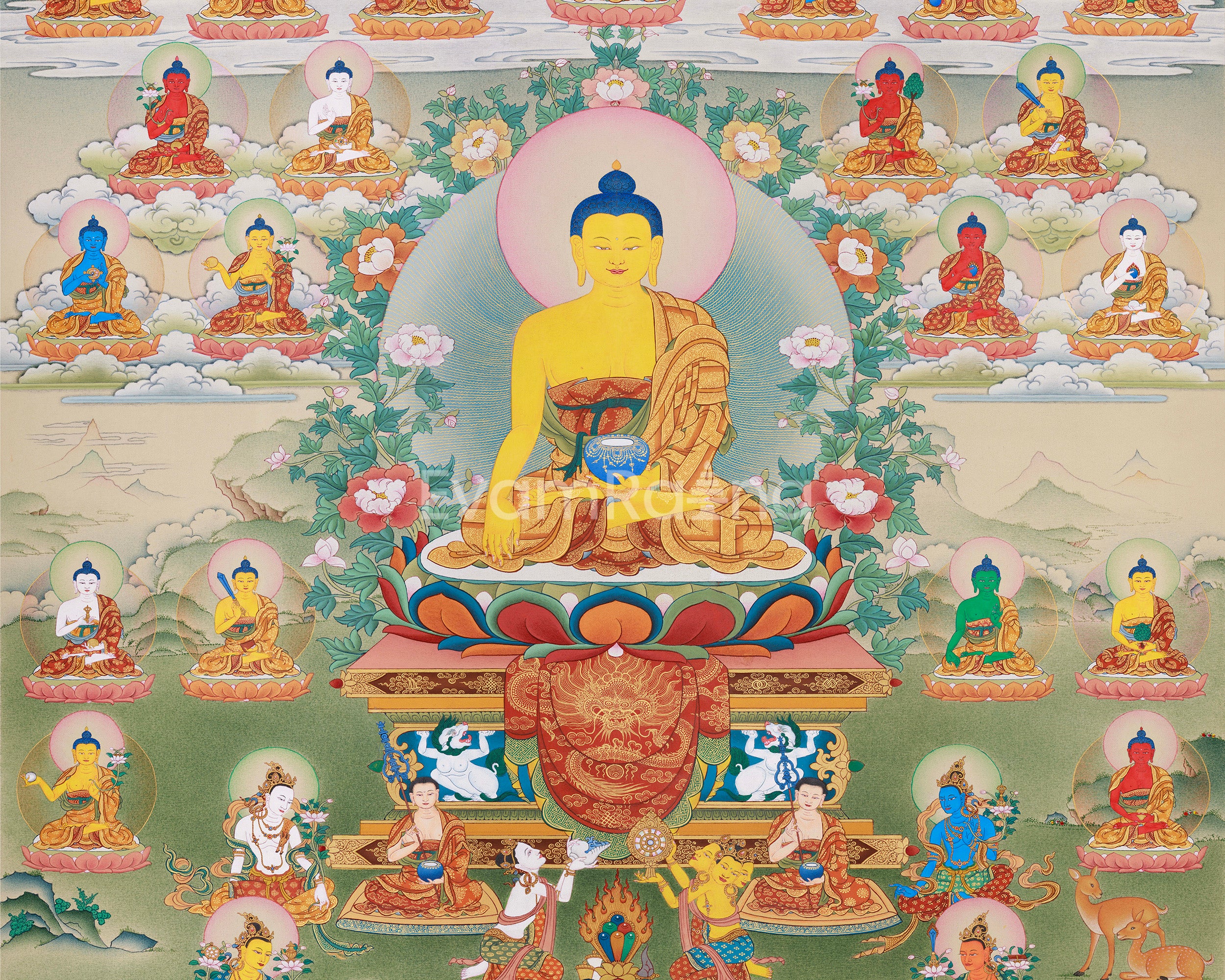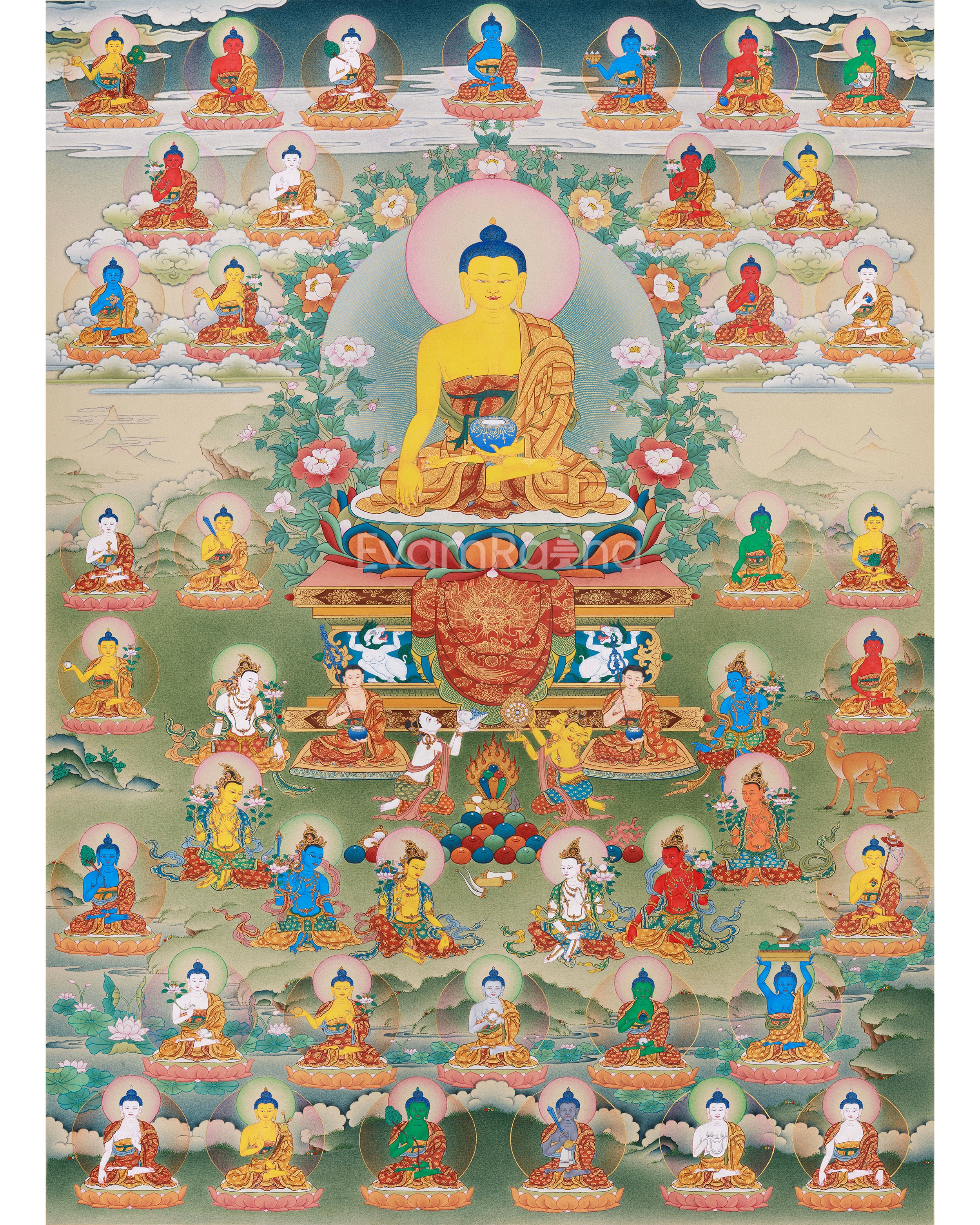 The 35 Buddhas of Confession, mentioned in the Sutra of the Three Heaps, are revered for their power to purify negative karma and support spiritual growth. In this thangka, they are portrayed with vivid colors and peaceful postures, each representing distinct virtues such as wisdom, compassion, protection, and purification. They are arranged around the central Shakyamuni Buddha, seated on lotus thrones set against a backdrop of floating clouds, distant mountains, and soft pastel skies. Each figure emanates a sacred glow, and the surrounding landscape illustrates a celestial domain where purity and compassion flow effortlessly. Together, the 35 Buddhas form a luminous mandala of liberation, a gateway to healing and spiritual renewal.