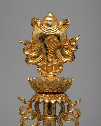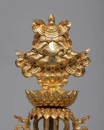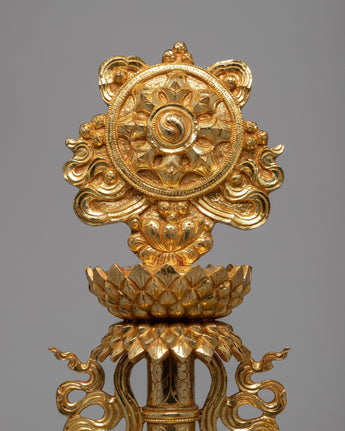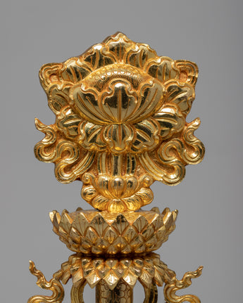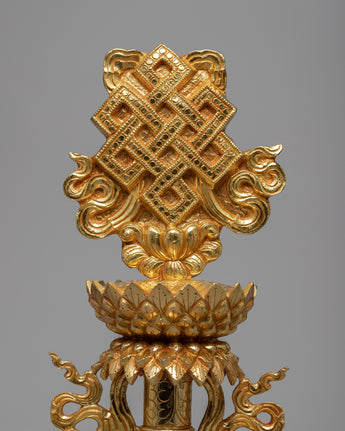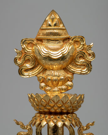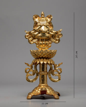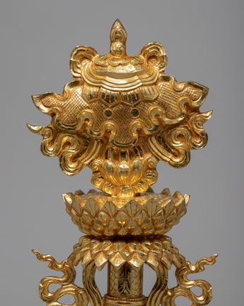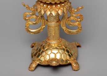 Our Buddhist Ashtamangala Set is a hand-carved unique 8 Auspicious Symbol made of pure copper and plated in pure gold with a turtle stand. This set includes lovely Ashtamangala sculptures representing growth and prosperity. These gold-plated auspicious symbols will be wonderful presents for your companions, friends, family, and yourself.