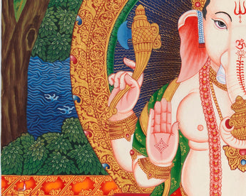 This beautiful Newari thangka Ganesh is one of the most popular guardian deities worshipped by Hindus and Buddhists alike.
