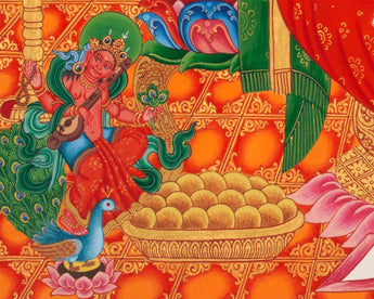 The use of bright red colors and intricate motif designs gives this thangka painting a distinct touch which the people of the Kathmandu valley of Nepal are popular for . The beautiful shading and exquisite gold work puts this thangka in a league of it's own.