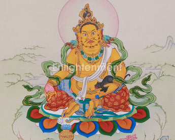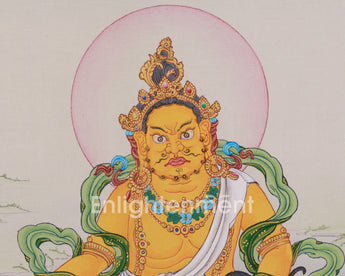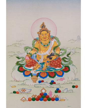 Invite the blessings of abundance and protection into your home with this stunning hand-painted yellow Dzambhala Thangka—order today and let his powerful energy transform your space!