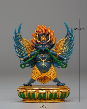 This Garuda statue depicts the mythological bird deity of Hindu and Buddhist traditions. Crafted from copper with electro gold plating and acrylic color detailing, it measures 10.5 cm in height, 8.5 cm in width, and weighs 0.28 kilograms. Its elaborate design highlights Garuda's majestic wings, powerful form, and expressive face, making it a significant piece for any spiritual collection.