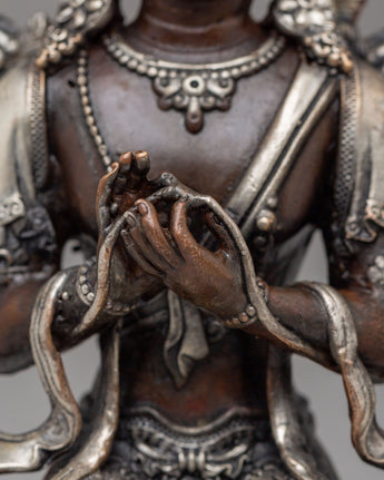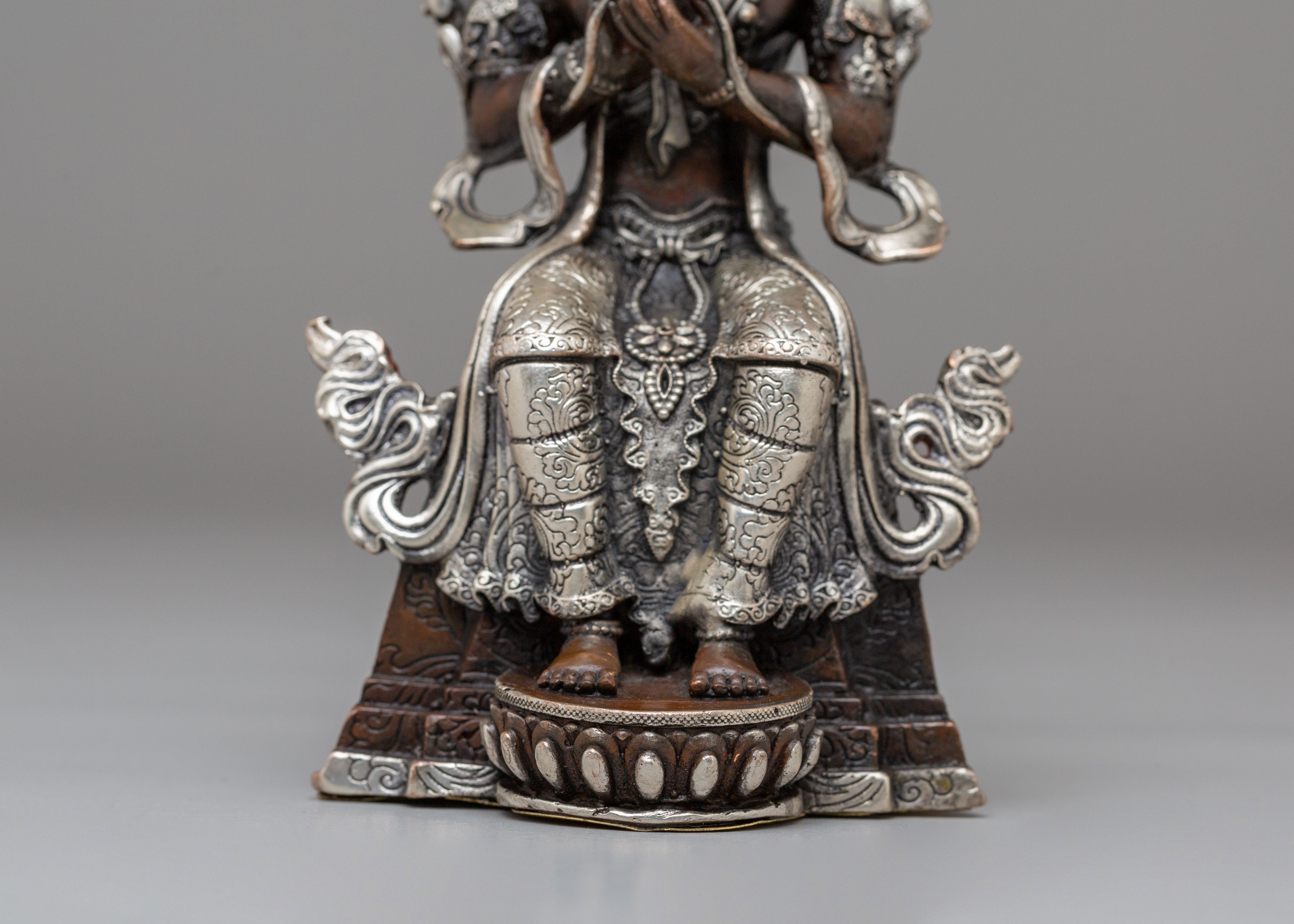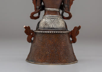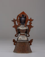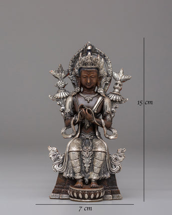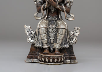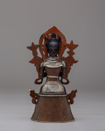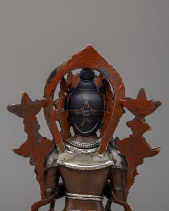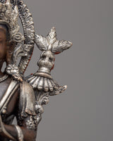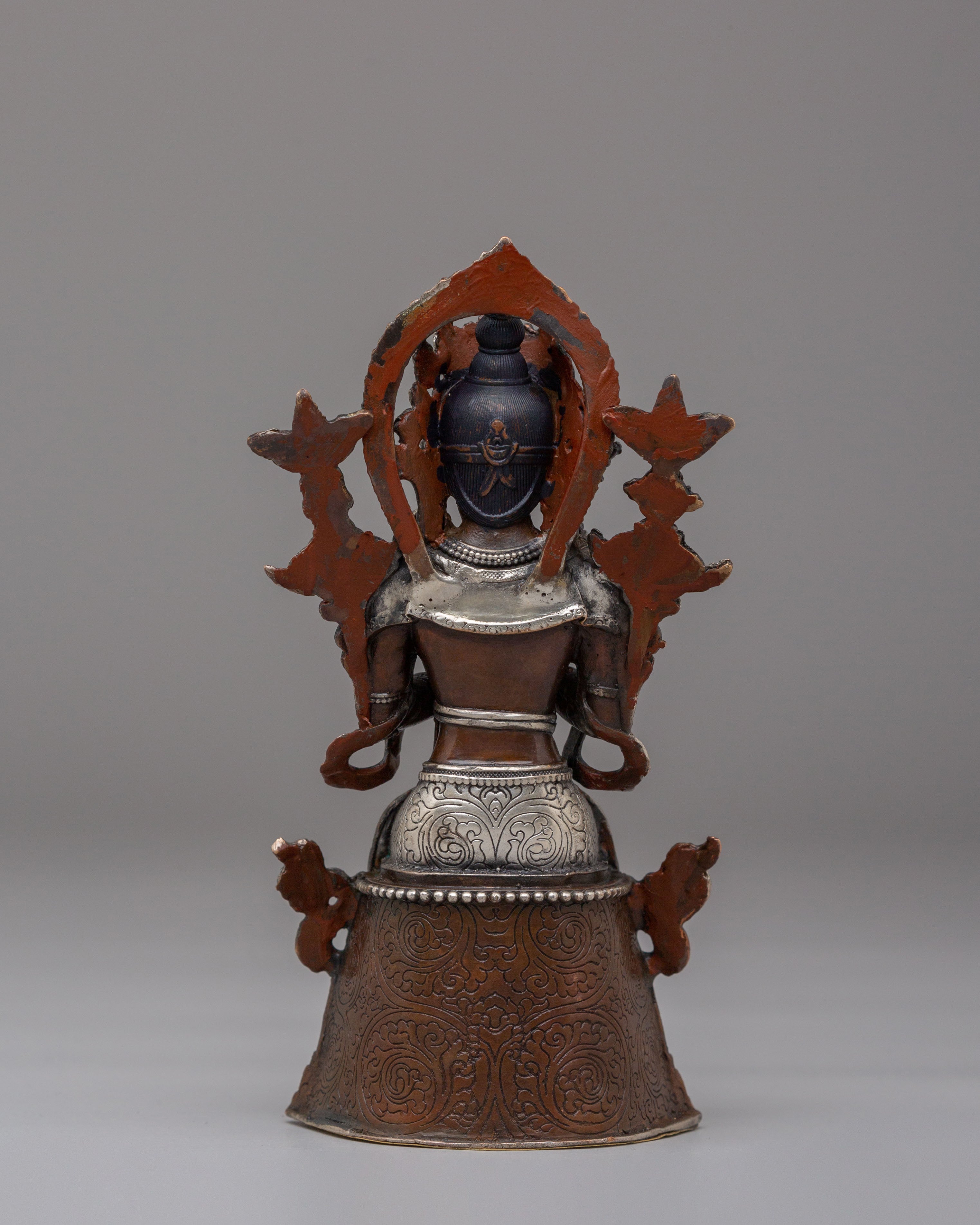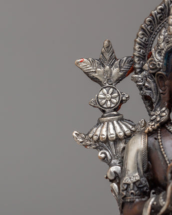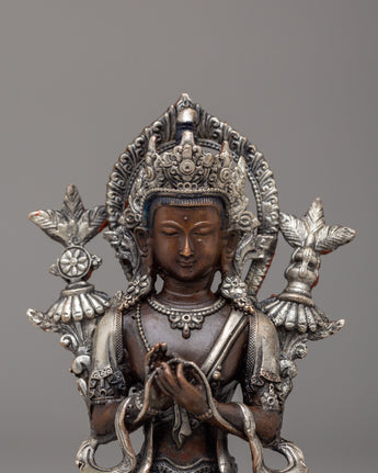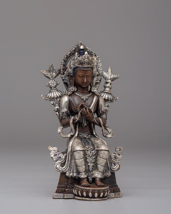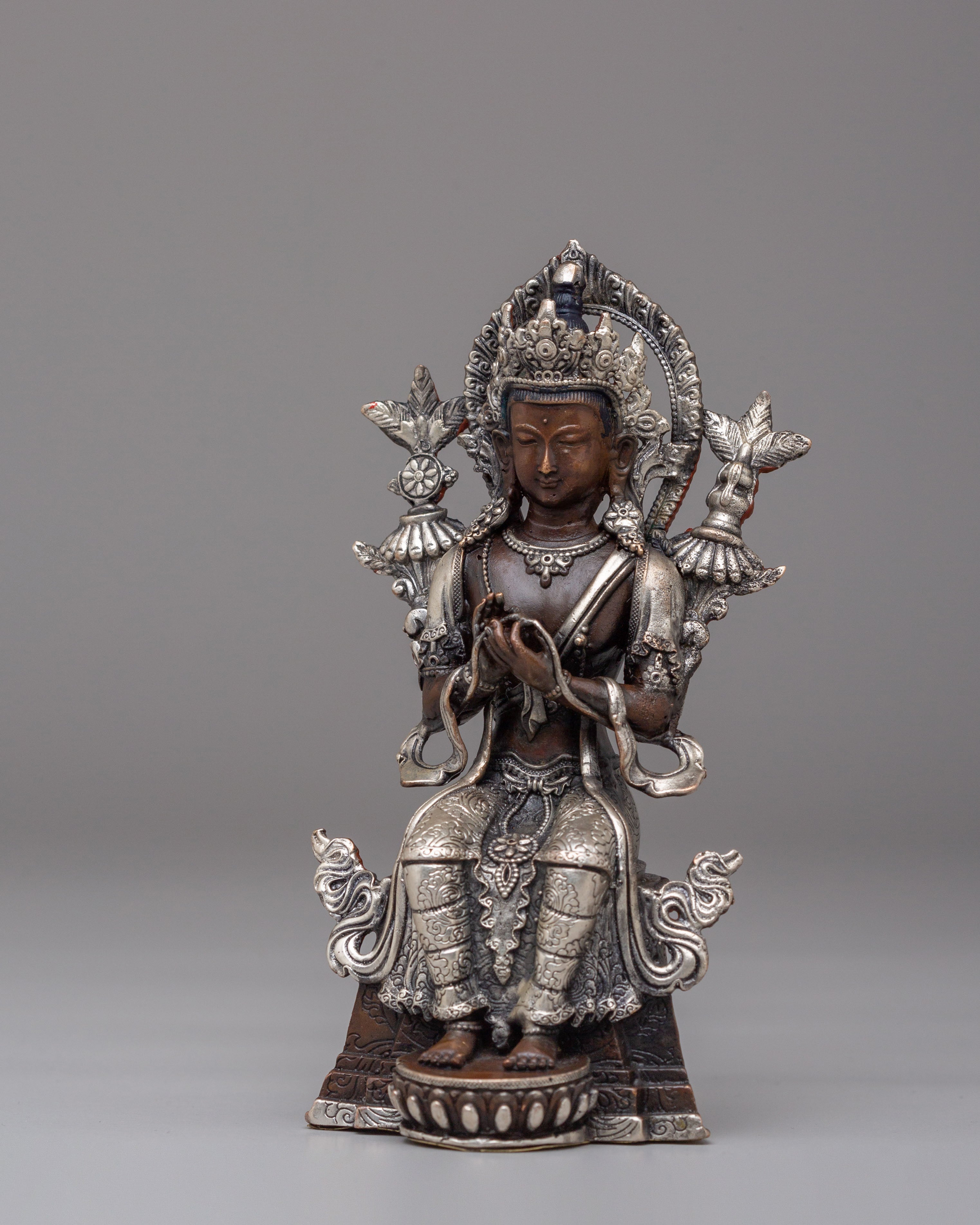 This Maitreya Buddha is seated gracefully on a lotus base, symbolizing purity and spiritual awakening. His right hand forms the dharma chakra mudra, representing the turning of the Wheel of Dharma and the teaching of the path to enlightenment. In his left lotus rests a dharma wheel, signifying the Buddha’s wisdom and the unfolding of spiritual law. In contrast, his right lotus holds a kalasha, a symbol of abundance and spiritual blessings. Crowning his head is a stupa, representing enlightened mind and sacred presence, and he wears a five-pointed crown, honoring the Five Dhyani Buddhas. The overall composition conveys both majesty and compassionate readiness to guide beings toward liberation.