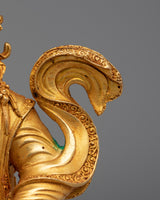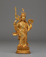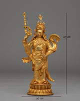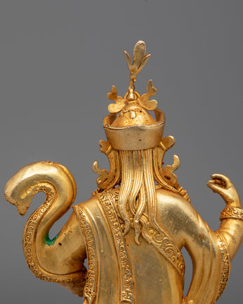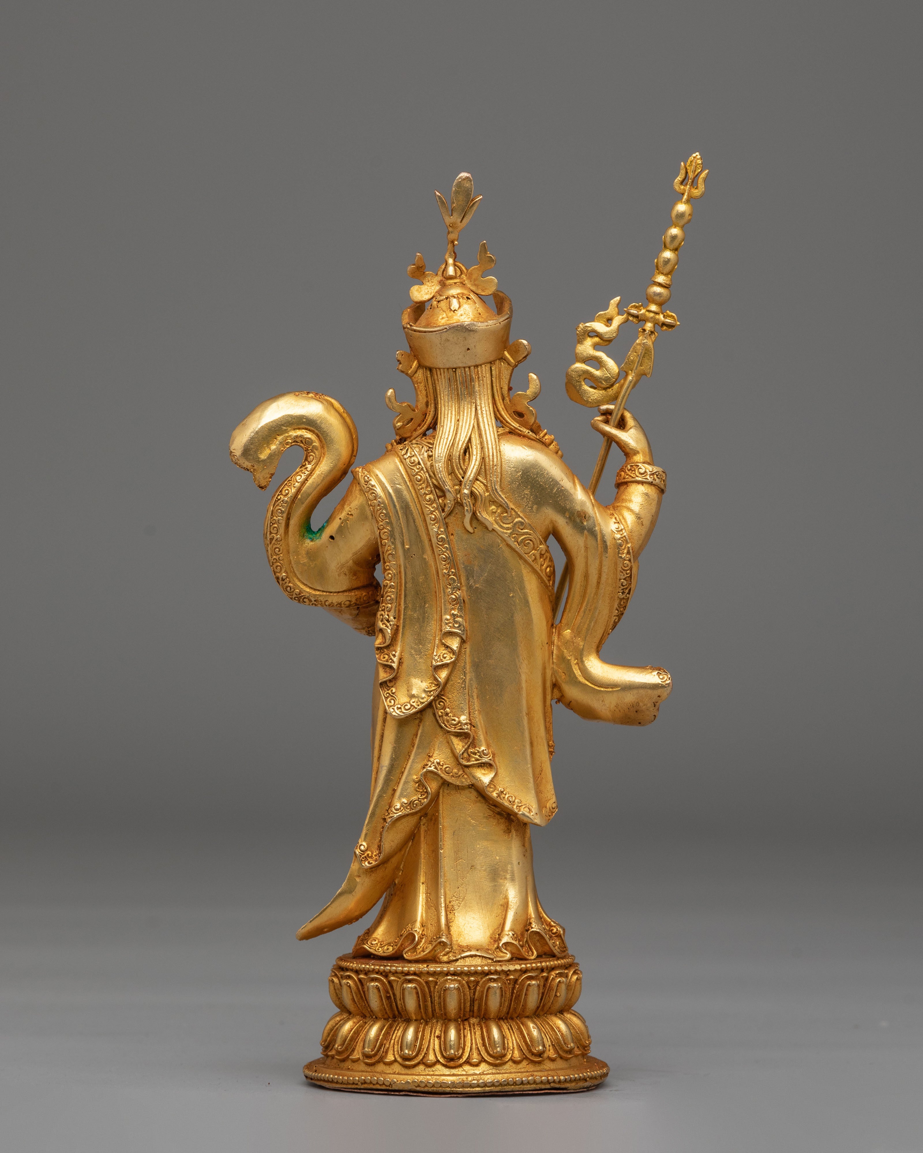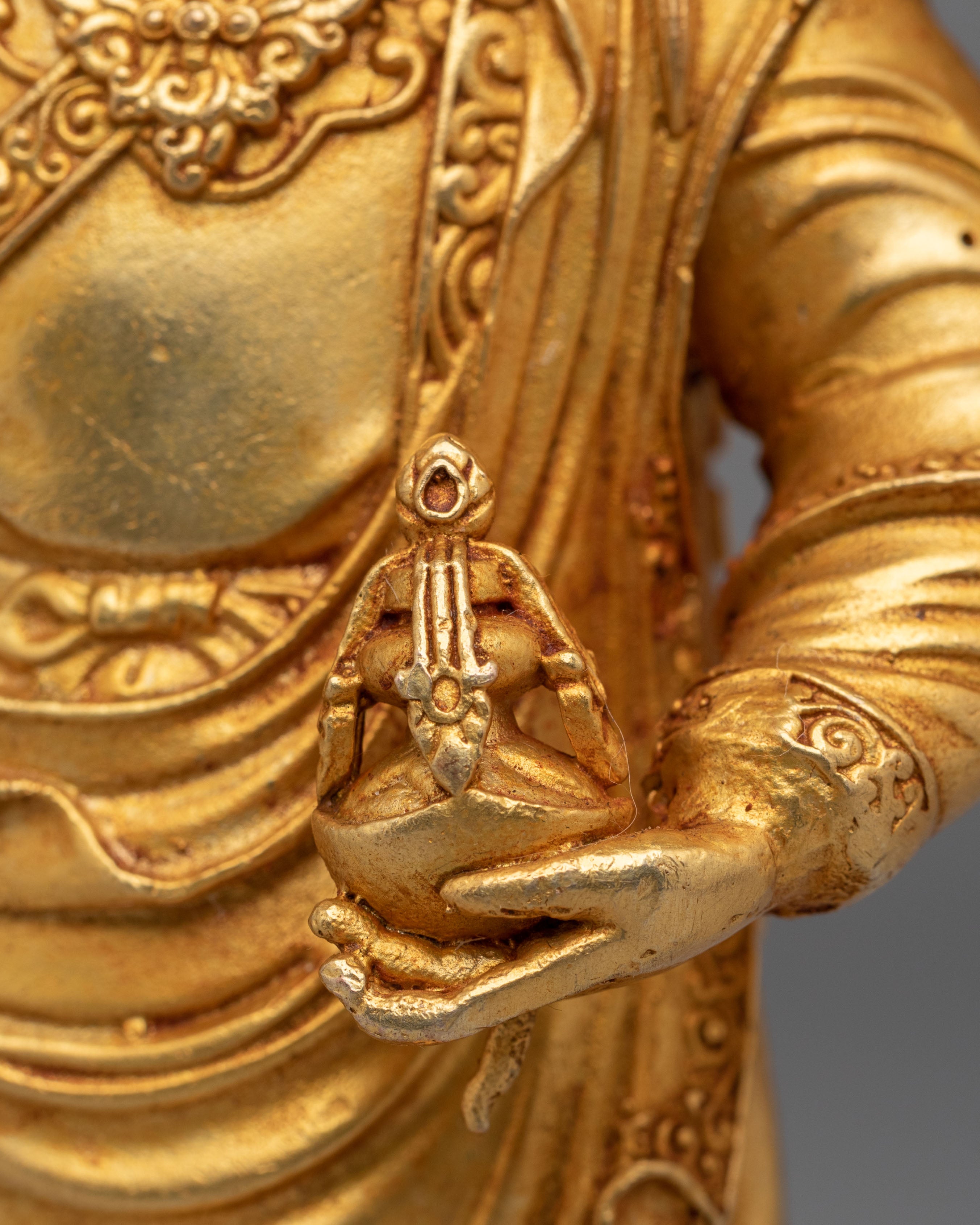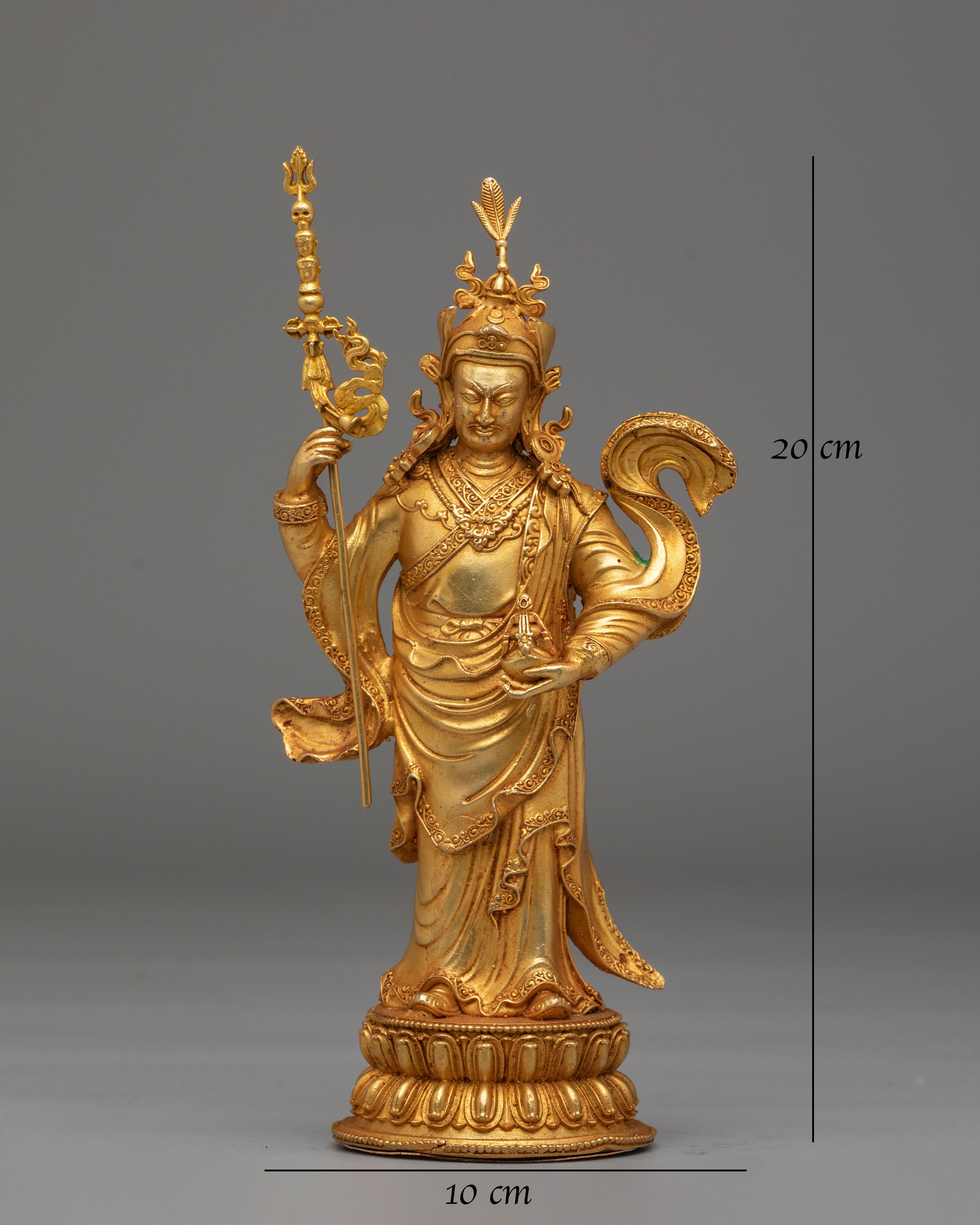 The statue depicts Guru Rinpoche standing gracefully with one hand raised in a gesture of teaching and the other holding a vase, symbolizing the transmission of wisdom and blessings. The detailed craftsmanship showcases Guru Rinpoche's serene expression, flowing robes, and symbolic ornaments, making it a truly captivating piece. The electro gold plating adds a luxurious touch, reflecting light beautifully and amplifying its sacred energy. Ideal for meditation, prayer, or as a decorative centerpiece, this statue will bring peace, harmony, and spiritual protection to any environment. Its presence not only enhances your space but also connects you to Guru Rinpoche's profound teachings and blessings.