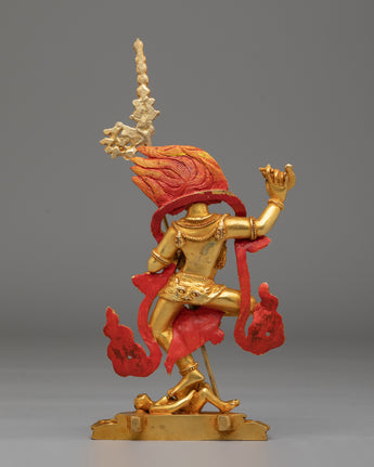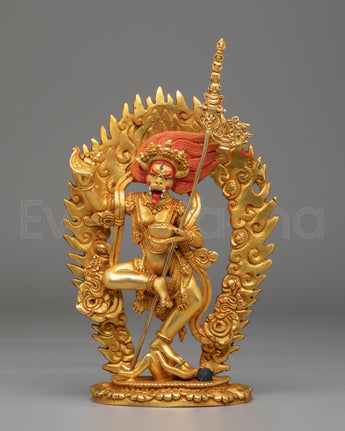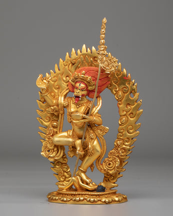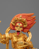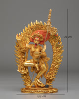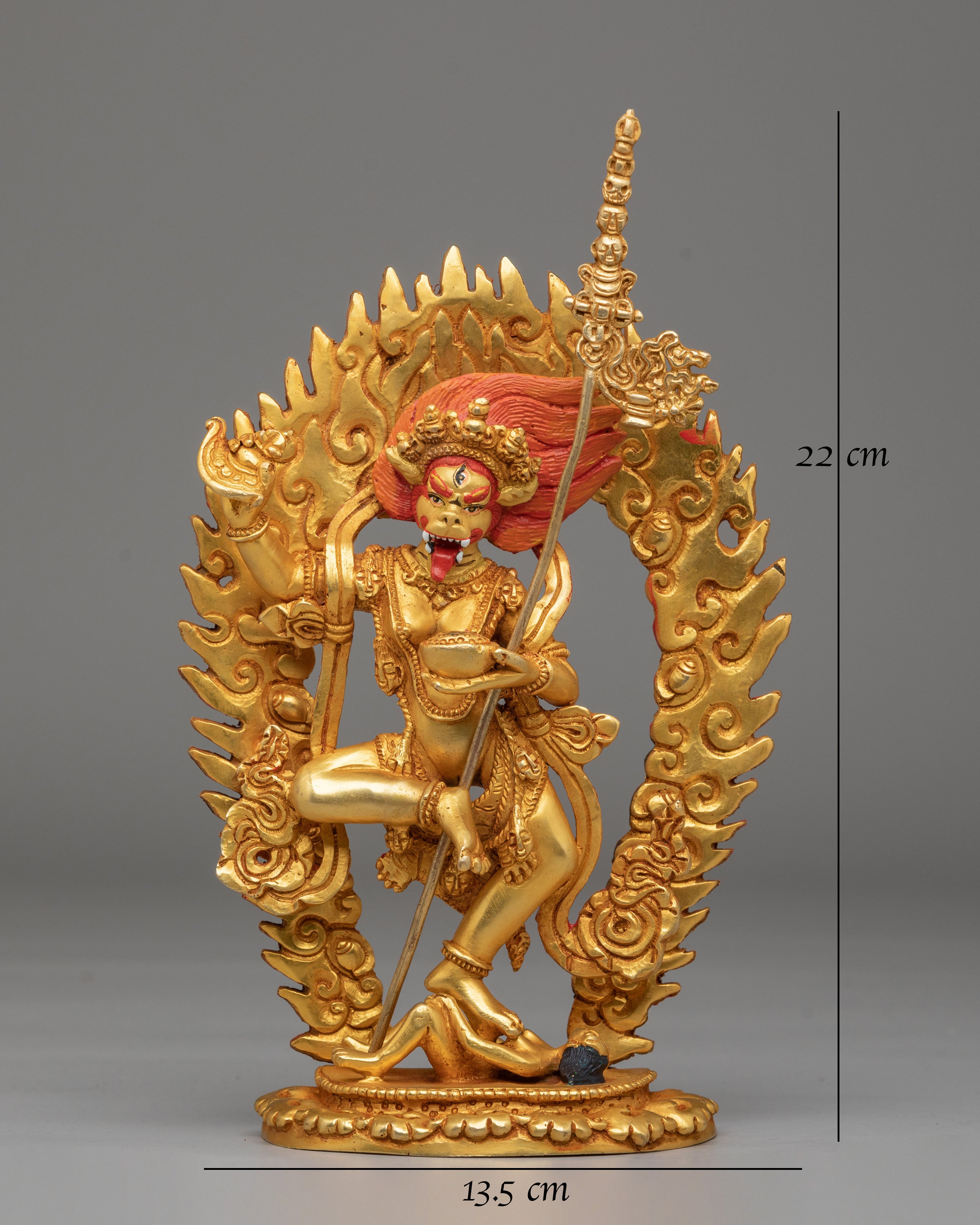 The Handmade Buddhist Simhamukha Statue is a striking representation of Simhamukha, the lion-faced protector deity revered in Tibetan Buddhism. Standing at 22cm tall and weighing 0.9kg, this statue is crafted from a copper body and adorned with 24K gold plating and vibrant acrylic colors. Simhamukha, often associated with the protection of spiritual practitioners and the removal of obstacles, is depicted with a fierce lion face, symbolizing courage, strength, and the ability to overcome evil forces. This statue serves as a powerful spiritual tool and a protective presence in any sacred space or altar.