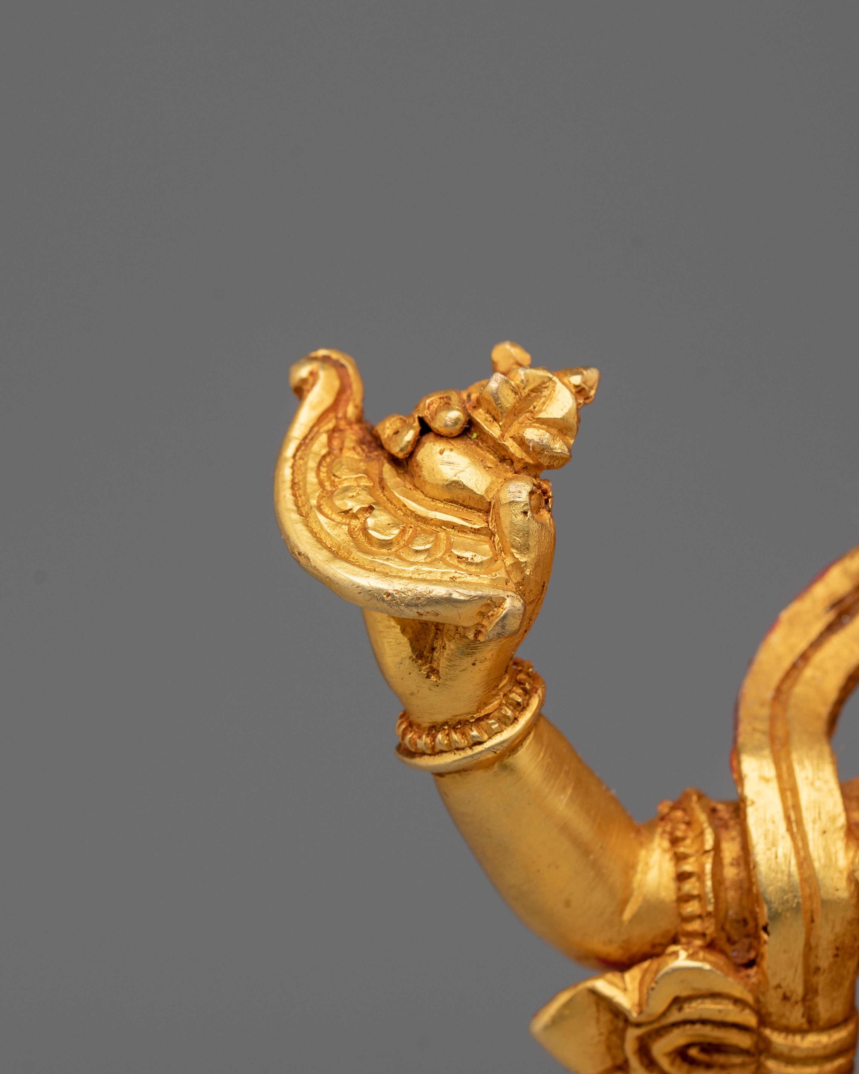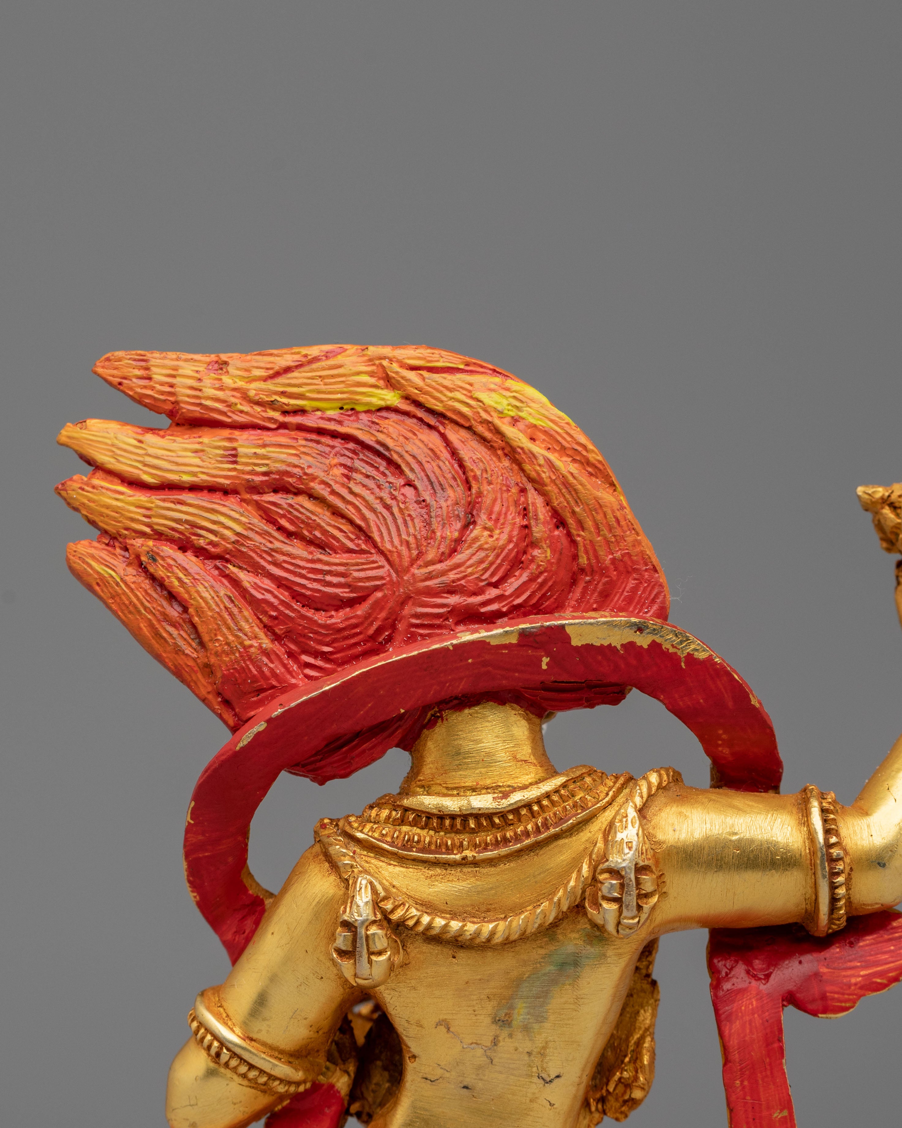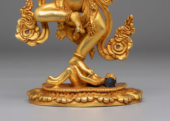 Simhamukha is an essential figure in Vajrayana Buddhism, embodying both wisdom and power. The lion face, fierce and commanding, signifies the destruction of negativity and the practitioner's empowerment to face challenges with courage. The 24K gold plating adds a radiant quality to the statue, symbolizing purity and enlightenment. At the same time, the acrylic colors accentuate the divine details of her features, creating a sense of sacred energy. The posture of Simhamukha, seated in a calm yet assertive stance, highlights her protective role in spiritual practices and meditation.