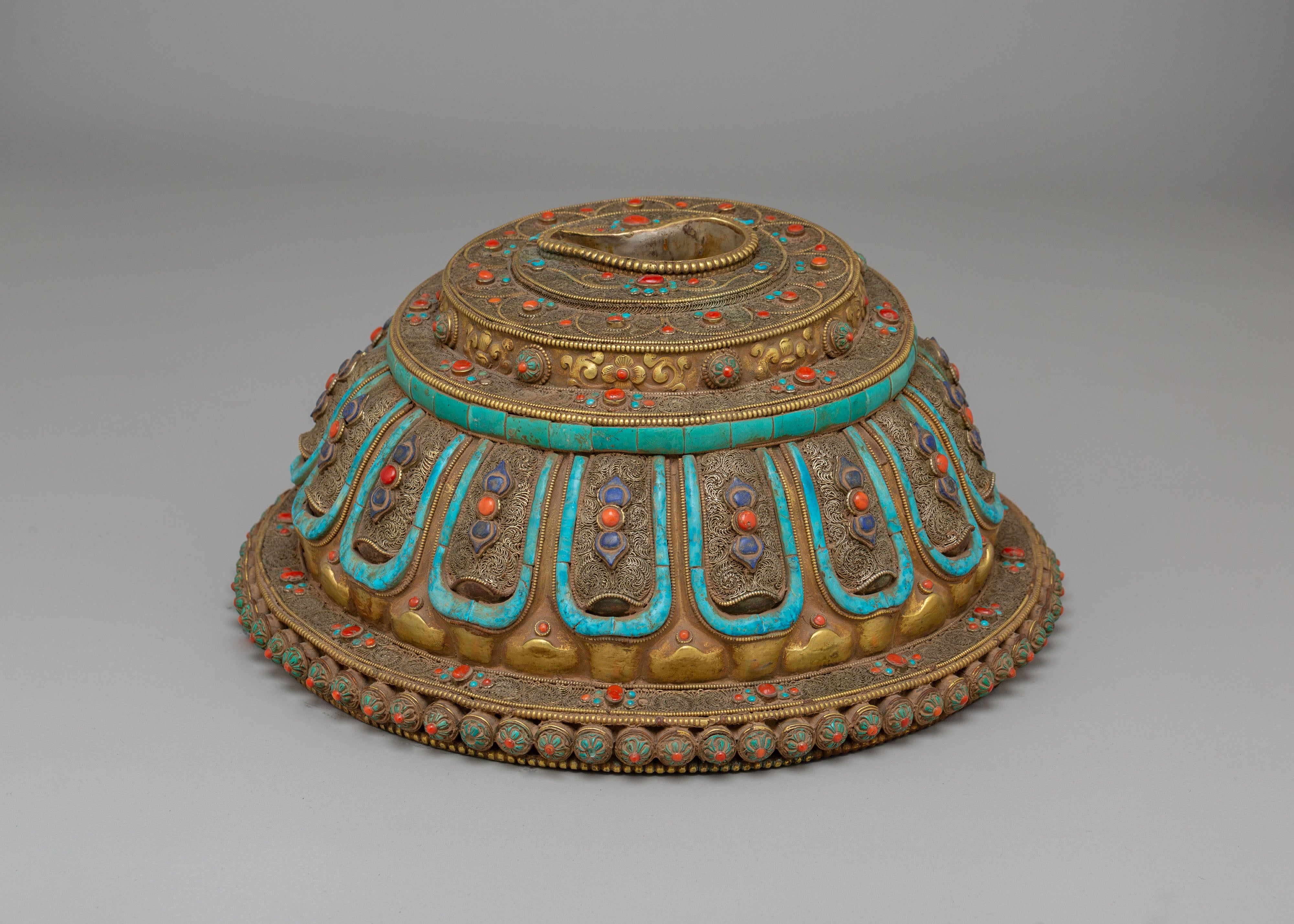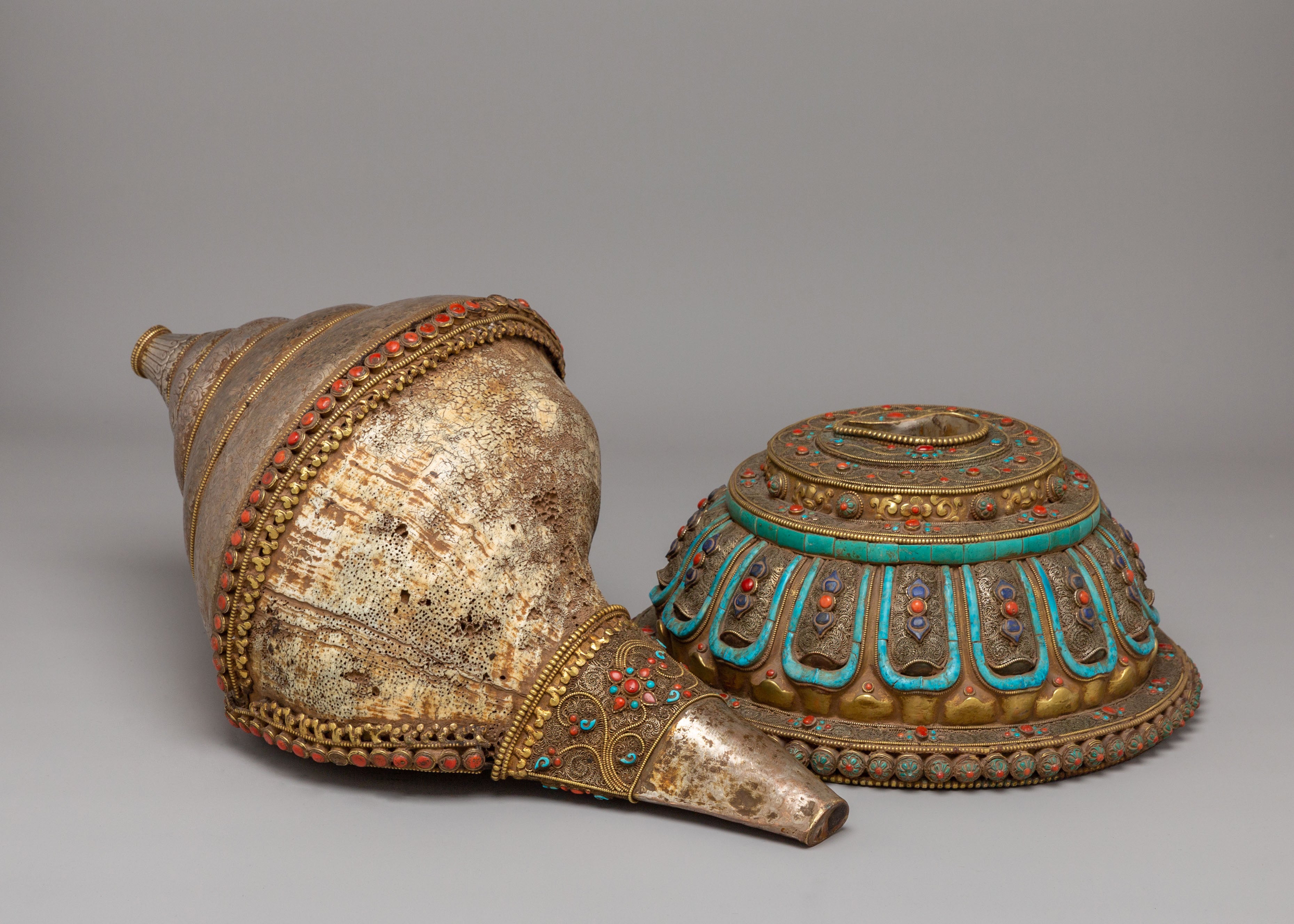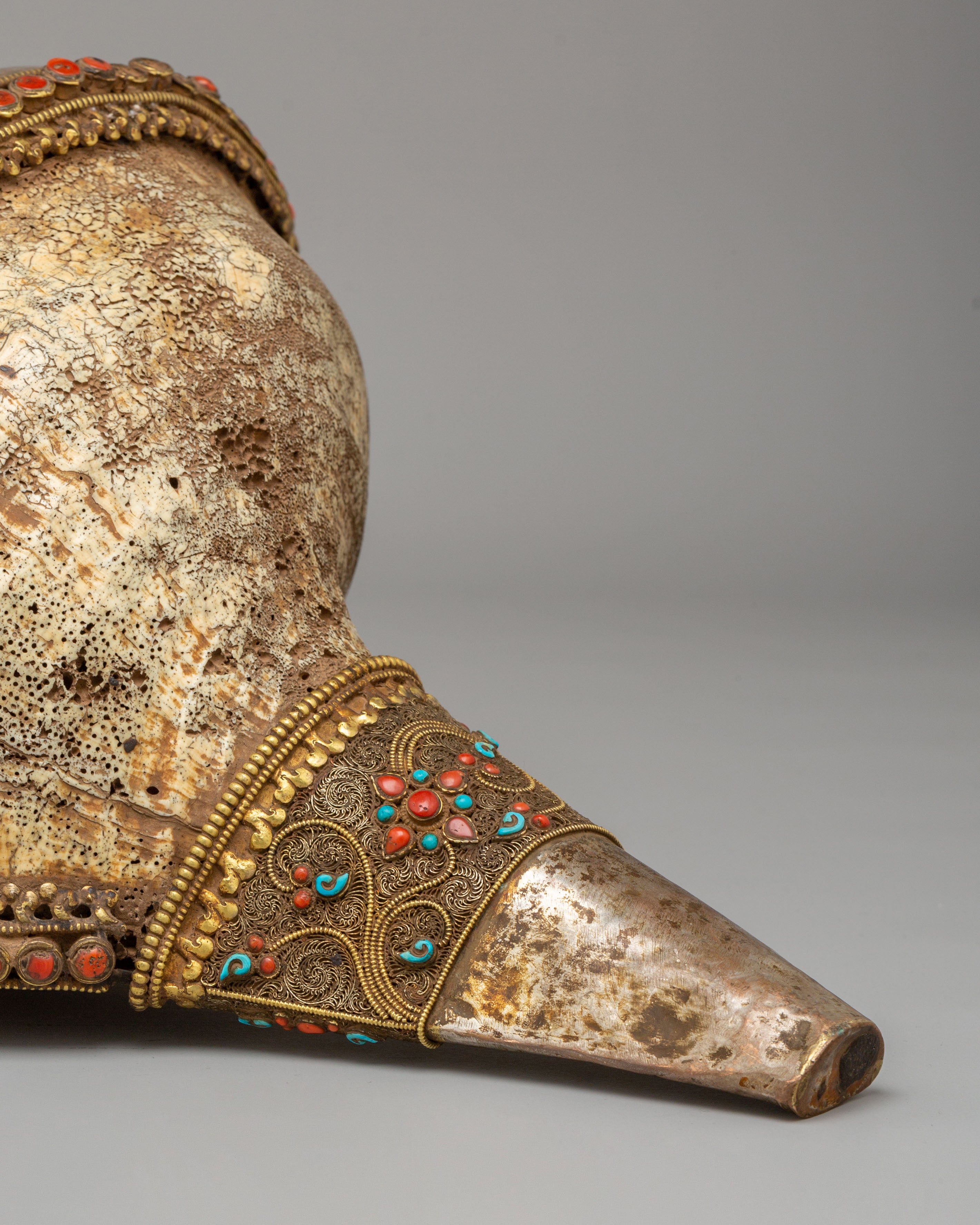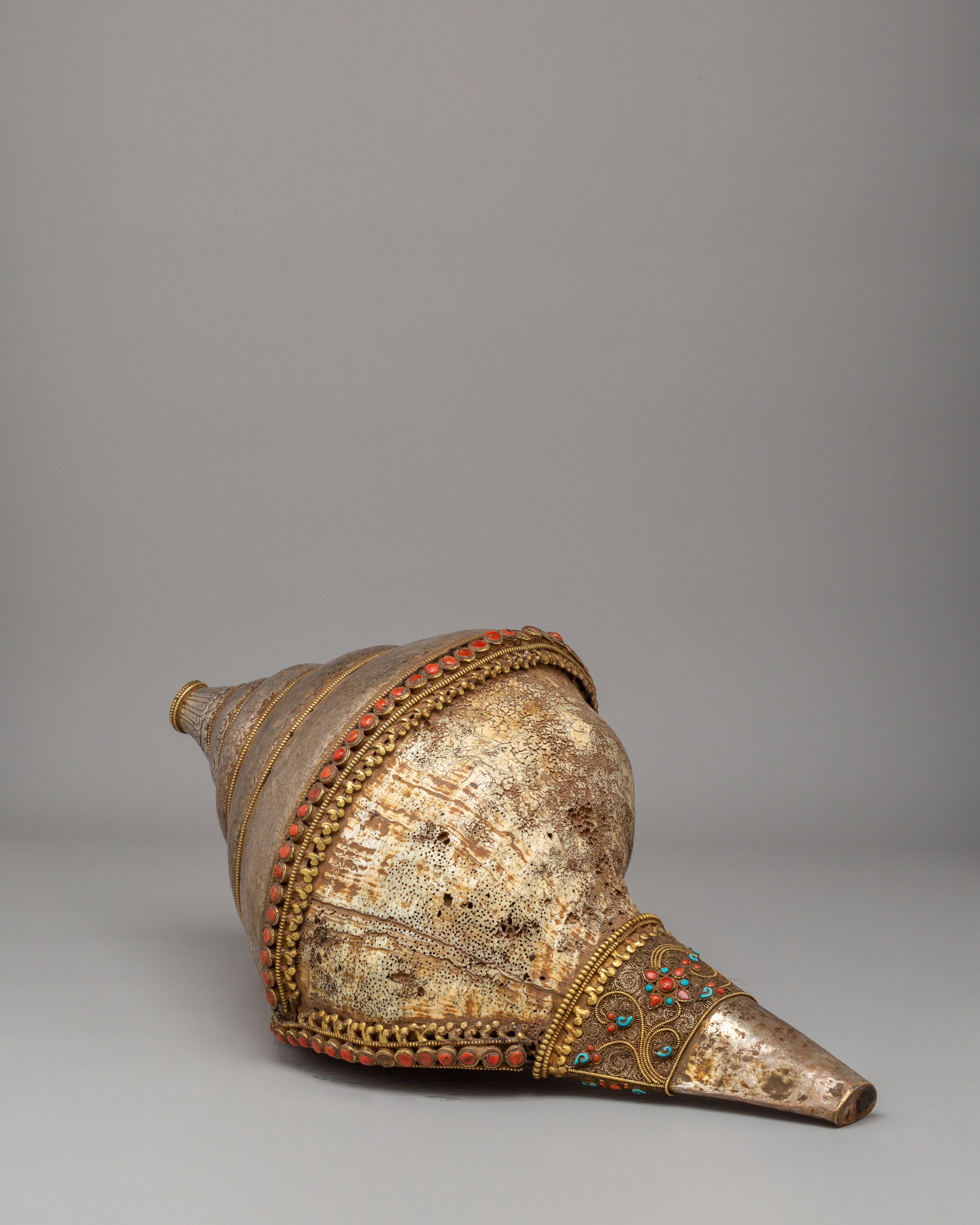 The Rare Decorative Sankha with Base is a remarkable ceremonial piece crafted from an antique sea shell, enhanced with silver work, natural stones, and detailed filigree patterns. The natural shape of the sacred conch is beautifully highlighted with fine metal decoration and colorful stone settings. The base is richly designed with carved patterns and turquoise-toned accents, giving the piece a grand and elegant presence. This high-value artwork is perfect for premium interiors, altars, or as a statement display piece.