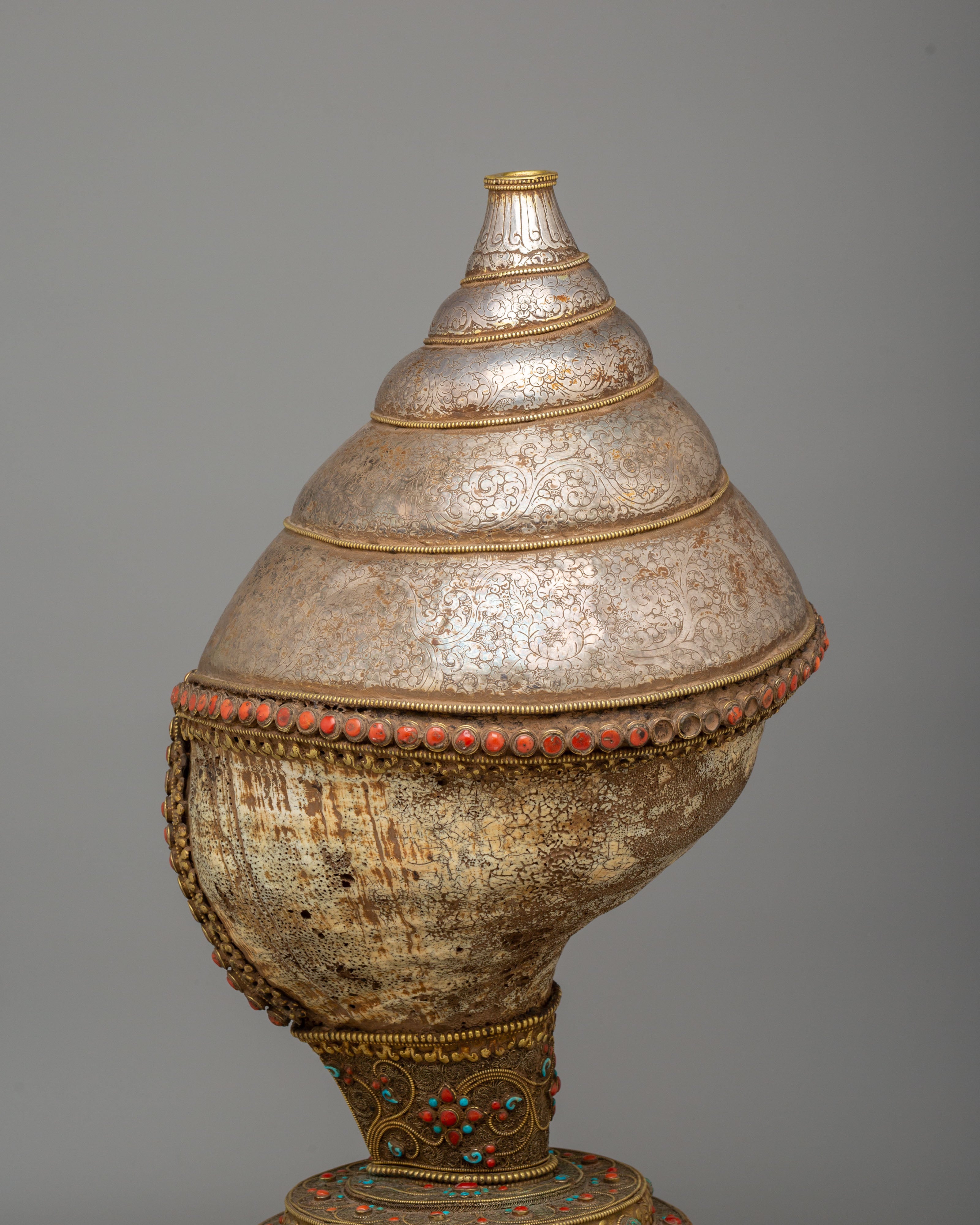 This rare Sankha is ideal for collectors and those who appreciate meaningful spiritual art. It brings a sense of tradition, blessing, and refined beauty into any space. The antique conch shell decor, luxury Sankha piece, silver filigree artwork, gemstone ritual object, sacred home decor, and high-end spiritual display make this piece truly special and valuable.