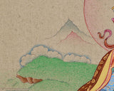 This thangka depicts Guru Padmasambhava seated on a lotus throne, symbolizing his birth and divine connection. His serene yet powerful presence is detailed, with multi-colored robes that show mastery over the elements. He holds a vajra, symbolizing unbreakable wisdom, and a lotus for purity and awakening. The mountainous, clouded background creates a peaceful, sacred mood that enhances his energetic form. The 24K gold highlights his divine power and wisdom. More than art, it is a spiritual relic that invites protection, wisdom, and blessings from Guru Rinpoche.