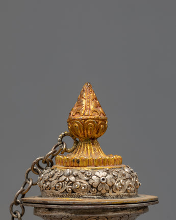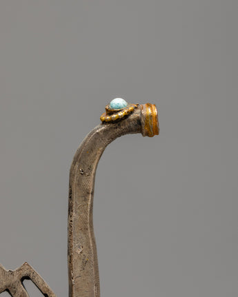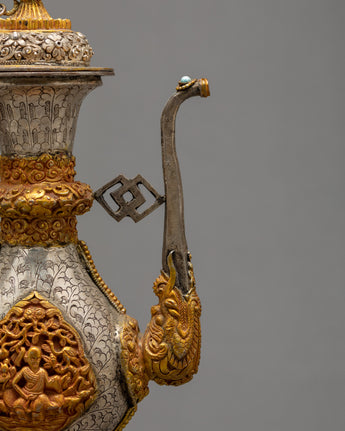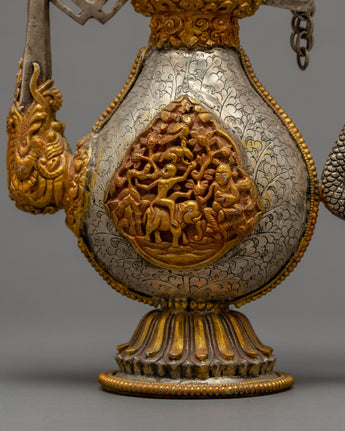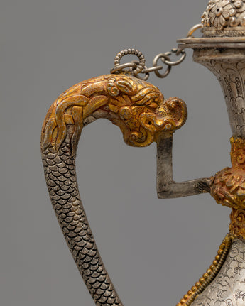 The Himalayan Buddhist Bhumba is made up of silver and plated with gold. It has a dragon holder and the top is studded with turquoise. The lid is finely chained with the bhumba. It is exquisitely hand-carved and engraved to give it a traditional look.