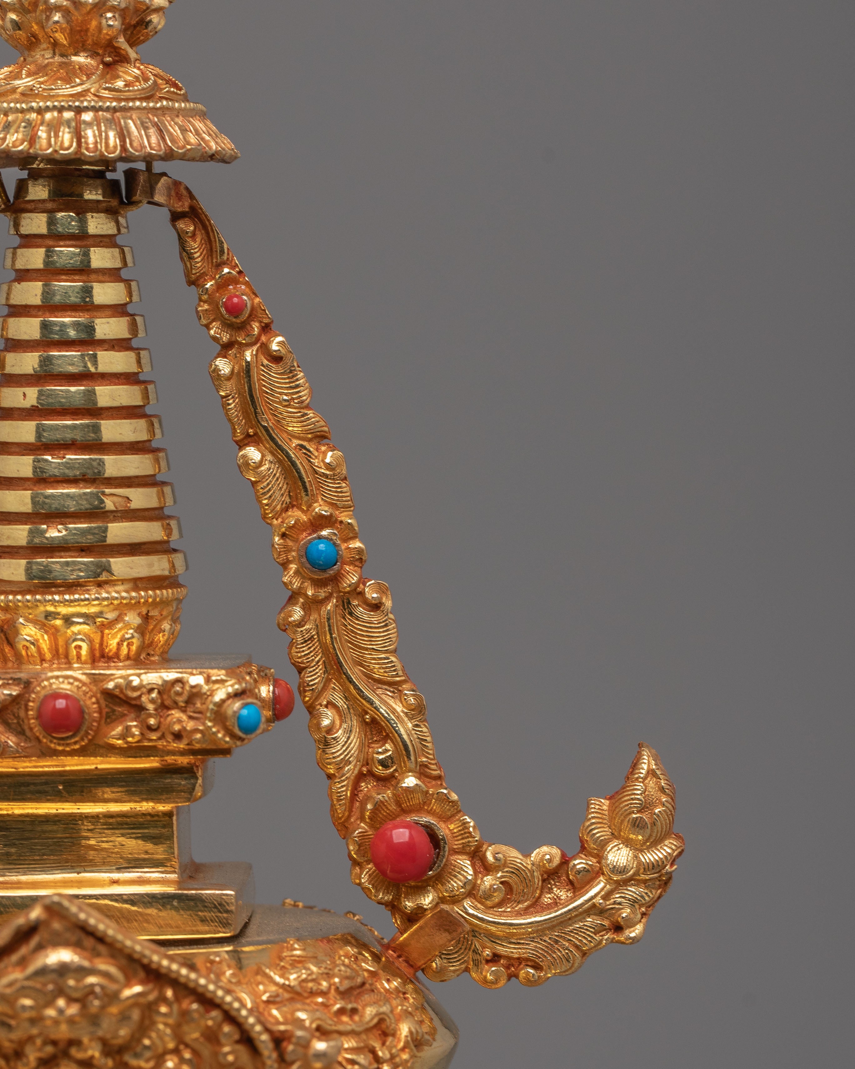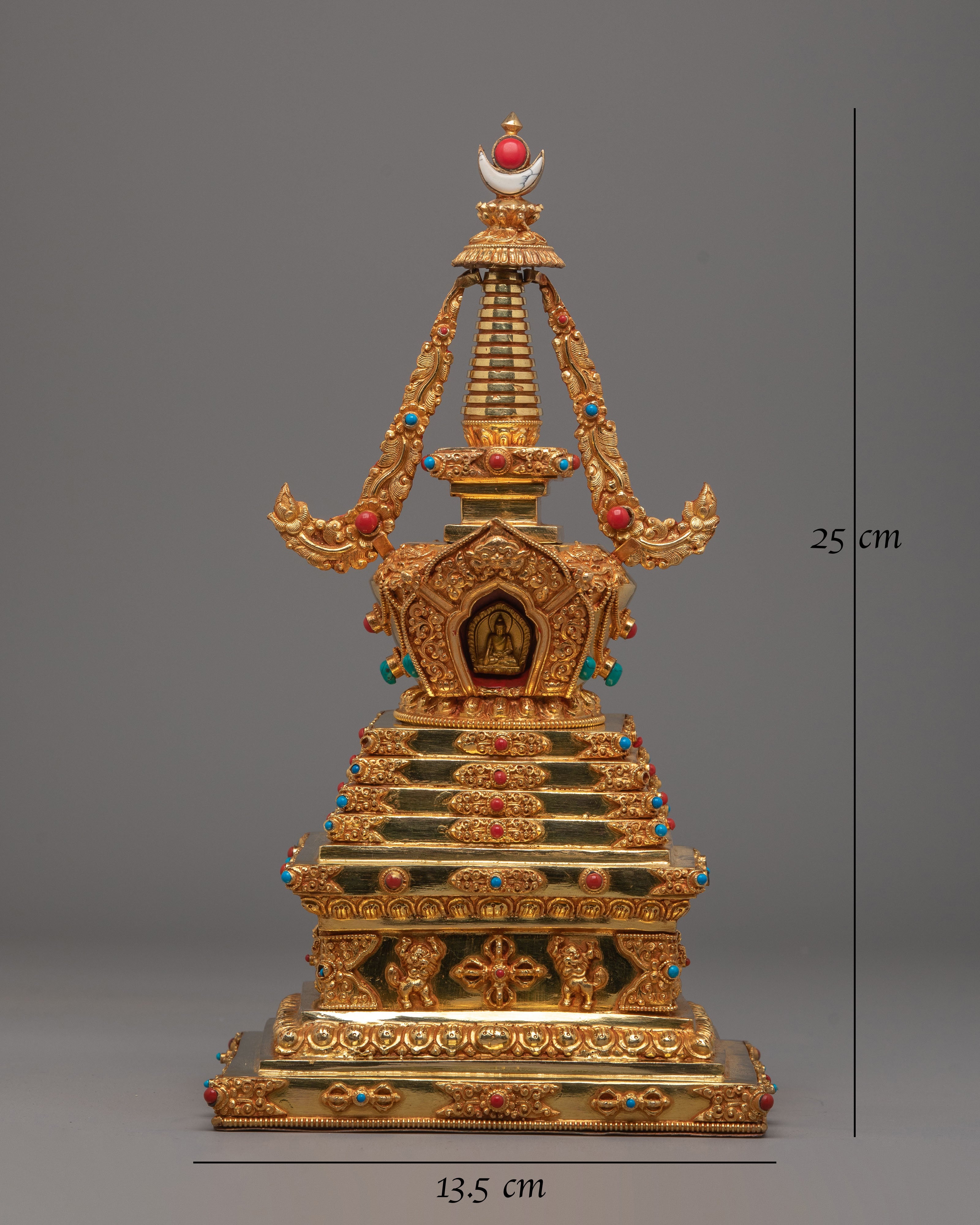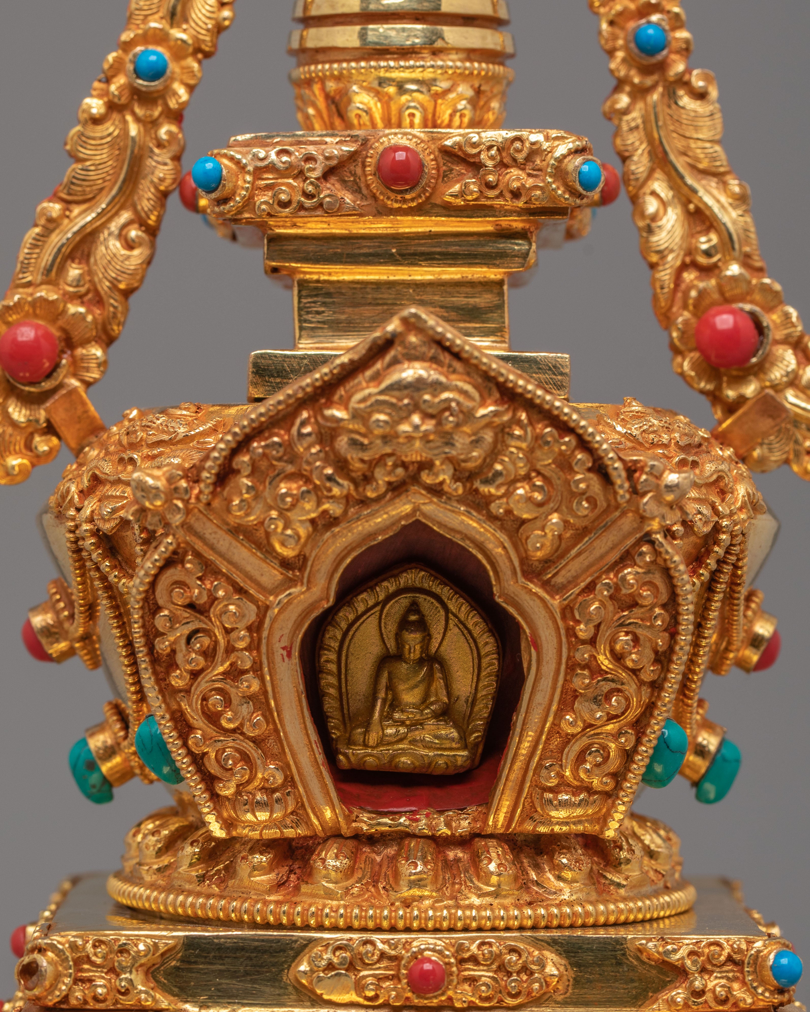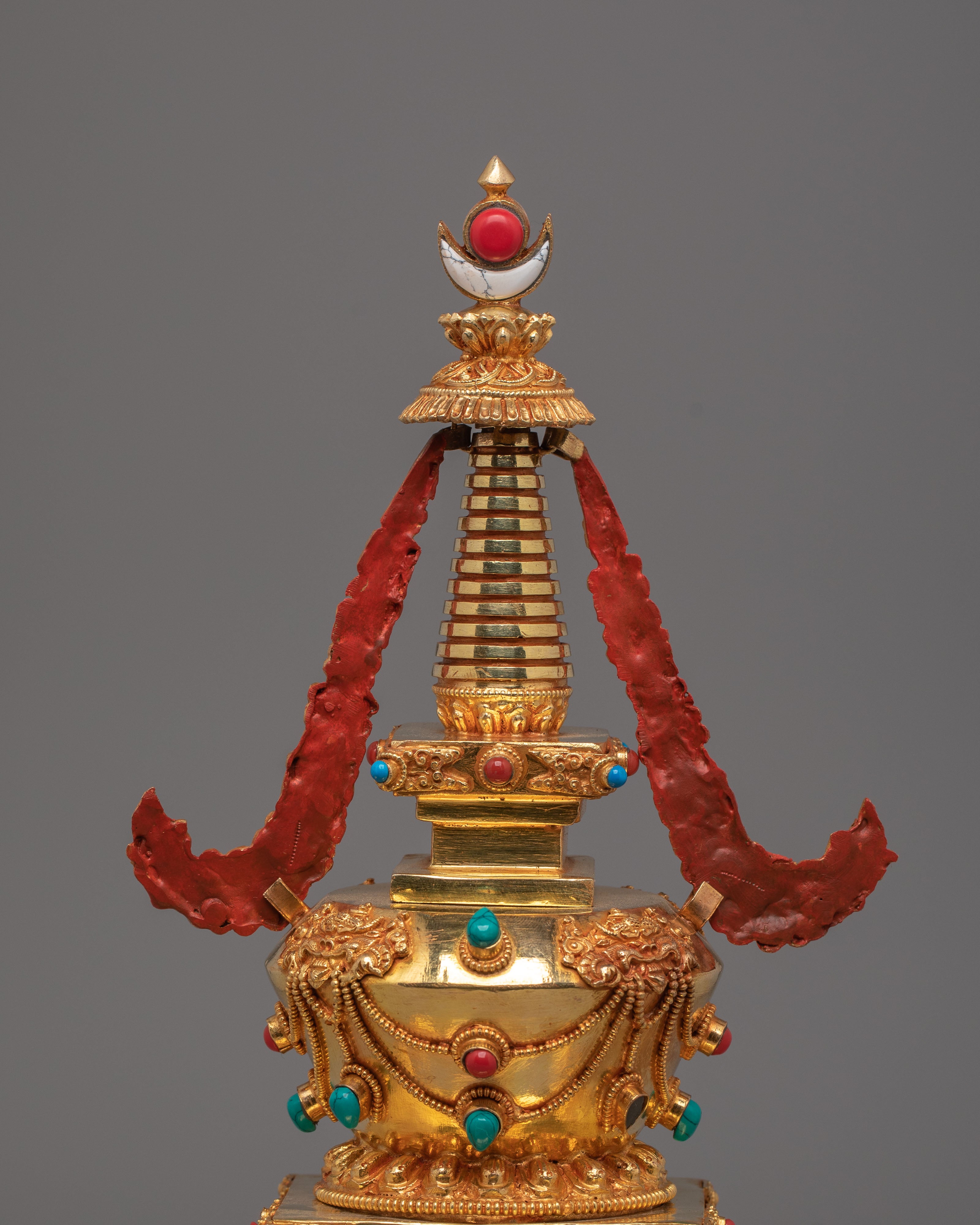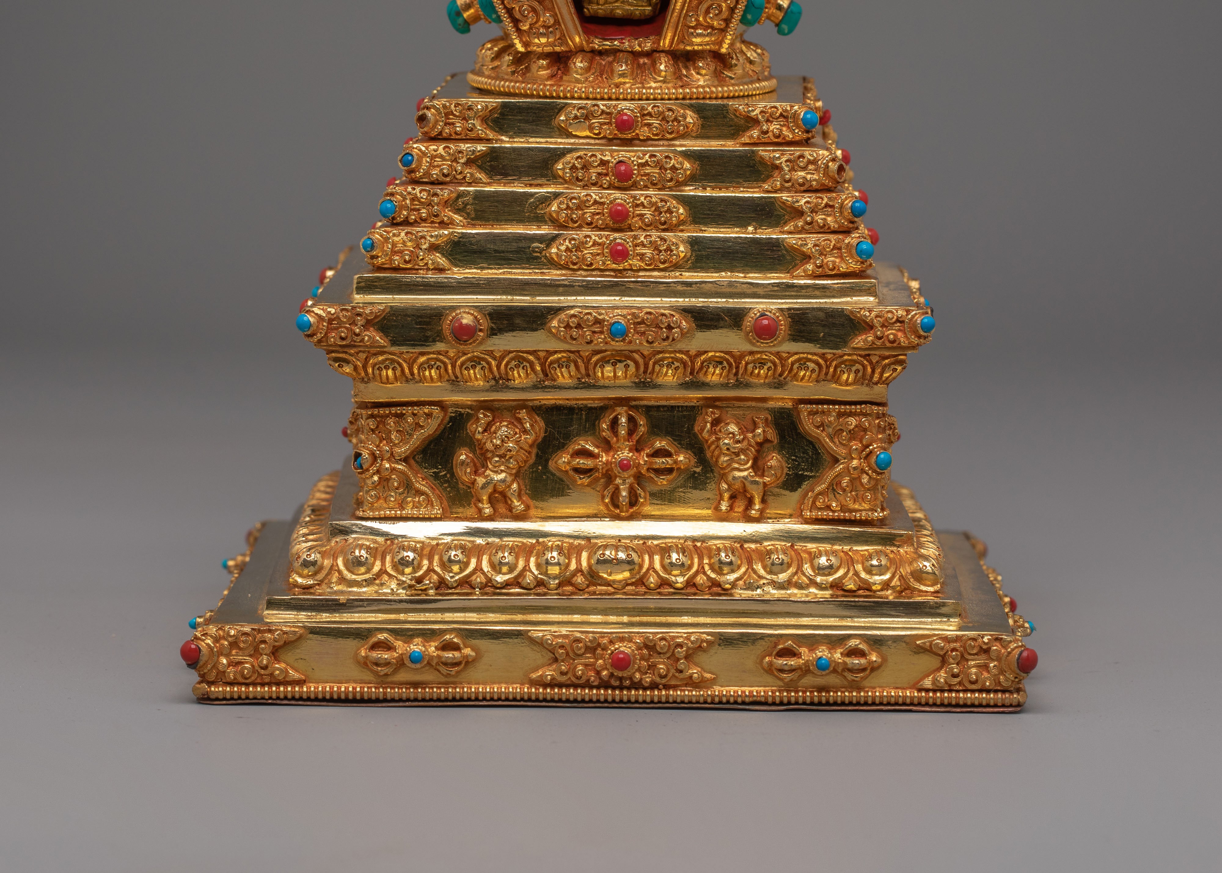 This Himalayan Ritual Stupa is designed to represent the path to enlightenment, serving as both a meditation tool and an ornamental piece. The sacred motifs and beautiful detailing reflect the spiritual journey, inviting peace and serenity into your environment. The gold-plated copper construction brings out the stupa's sacred energy, while the coral and turquoise stones enhance its spiritual presence.